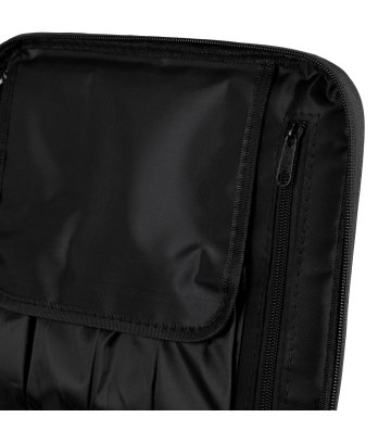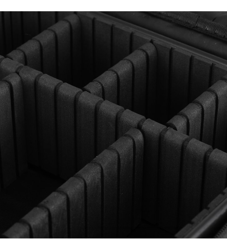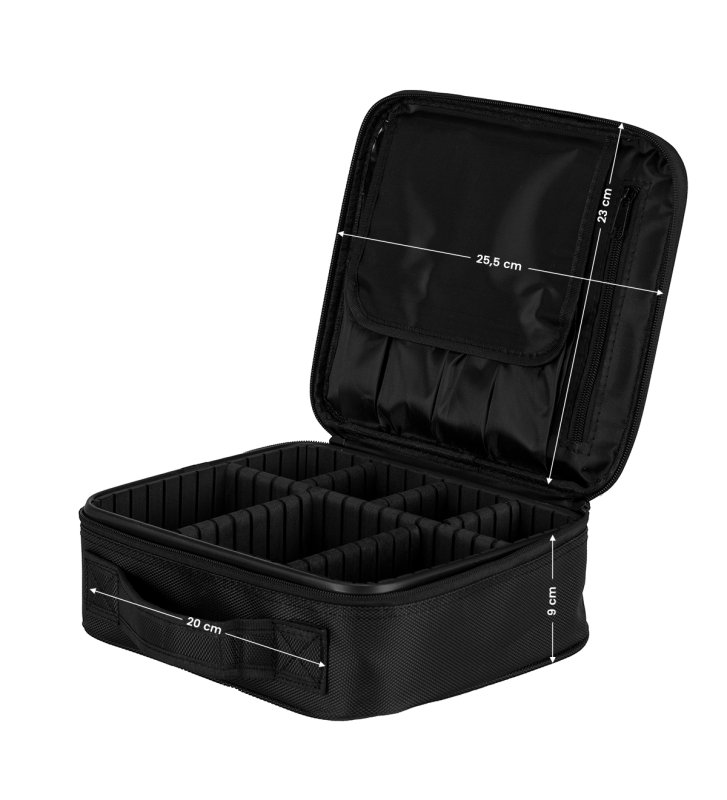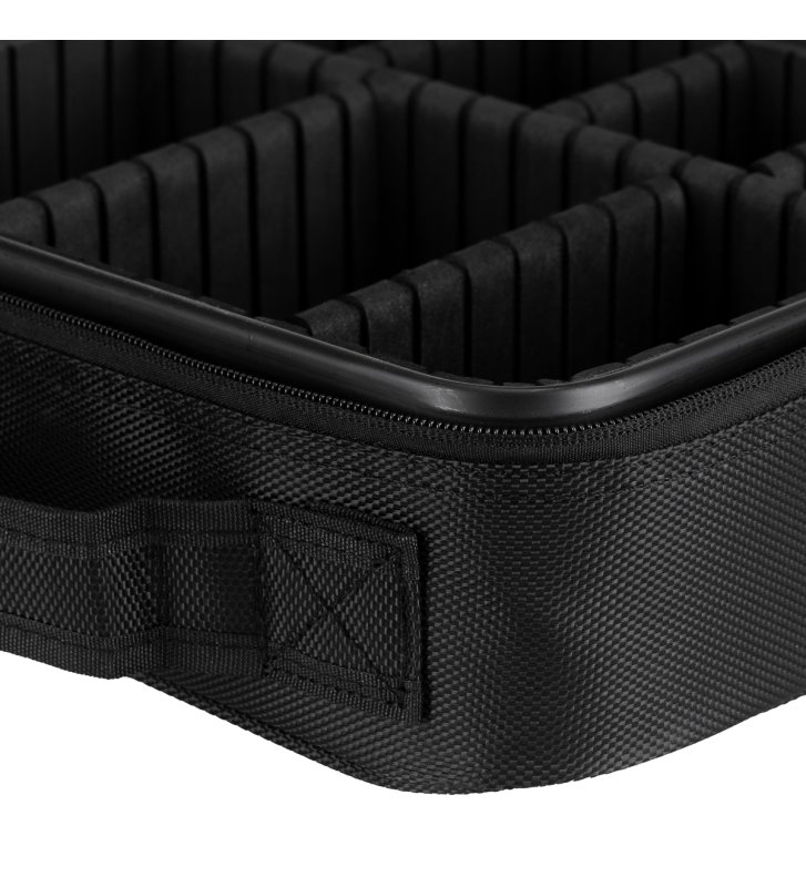 Pojemna komora kuferka umożliwia efektywną organizację narzędzi. Regulowane przegródki pozwalają na dostosowanie wnętrza do indywidualnych potrzeb użytkownika. Klapa kuferka wyposażona jest w kieszonki i przegródki zamykane na zamek oraz rzep dla zwiększenia funkcjonalności – idealne do przechowywania pędzli lub innych płaskich akcesoriów.
