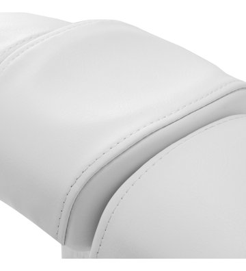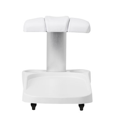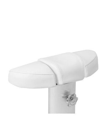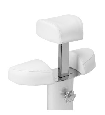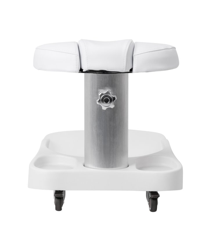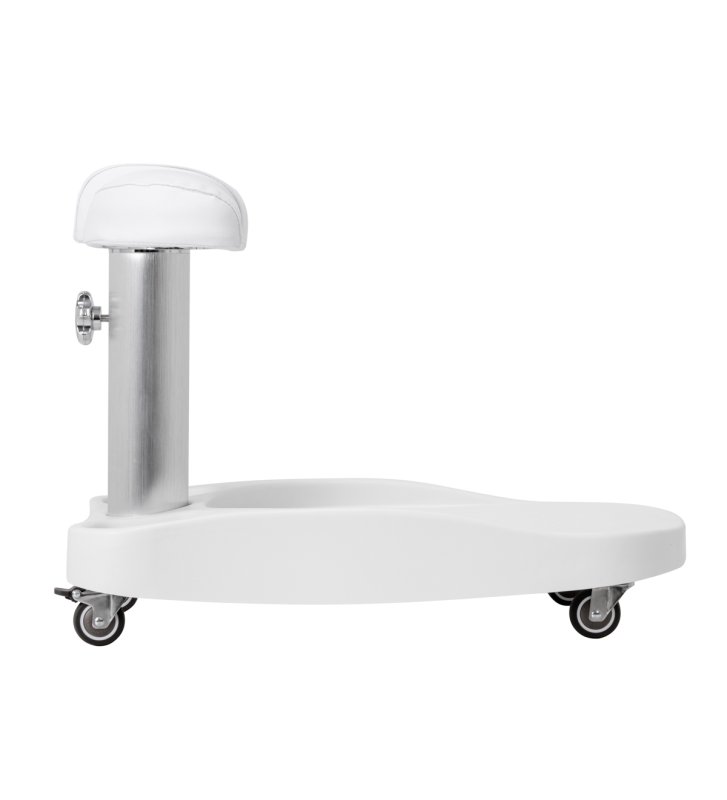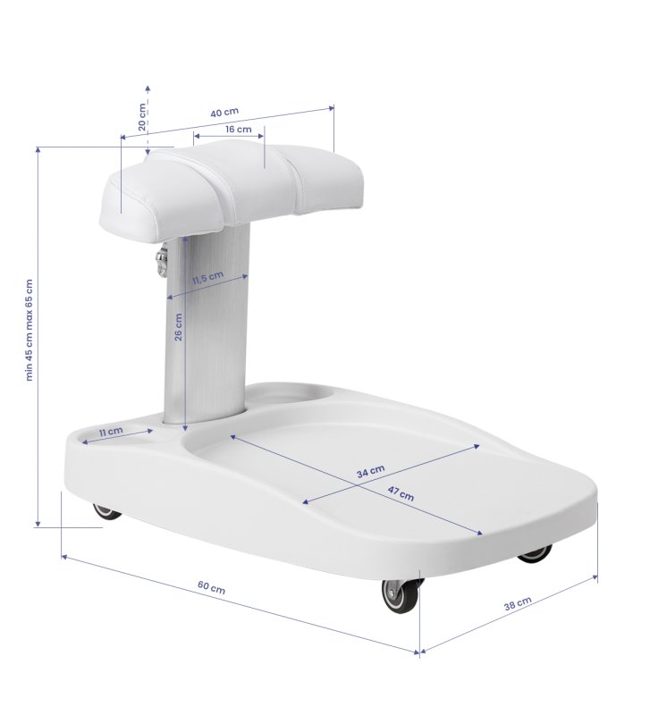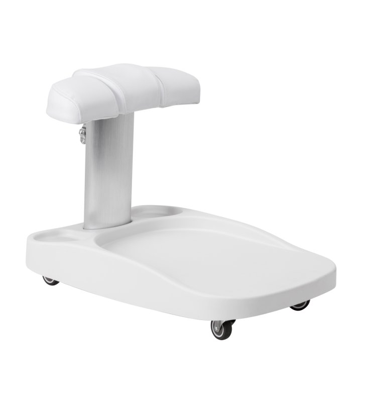 Podnóżek składa się z trzech części, z których środkowa jest wysuwana. Ręczna regulacja wysokości umożliwia podniesienie jej o maksymalnie 20 cm. Wszystkie elementy podnóżka obite są skórą syntetyczną, co zapewnia odporność na wilgoć oraz łatwość utrzymania czystości. Dzięki temu wózek można dostosować do indywidualnych potrzeb użytkownika, co sprawia, że jest doskonałym rozwiązaniem zarówno podczas zabiegów kosmetycznych, jak i podologicznych, zapewniając komfort i precyzyjność pracy w różnych pozycjach.