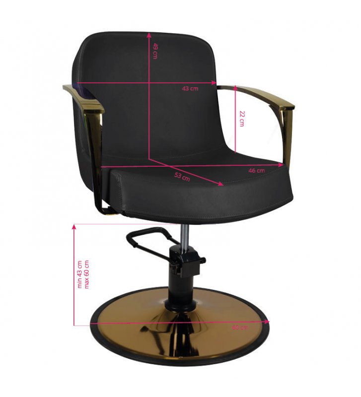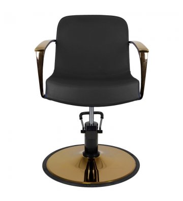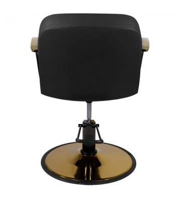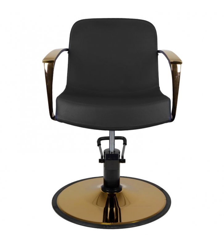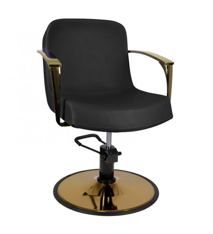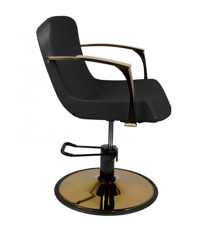 A modern hairdressing chair with a unique design and extraordinary quality. Metal elements shine with the color of gold, enhancing the sense of luxury. Very comfortable, ideally suited to modern living rooms. Specially profiled to provide the client with a comfortable position during the procedure. Adjustable in the vertical plane. Very stable and solid. Upholstered in high-quality eco-leather. Black colour.