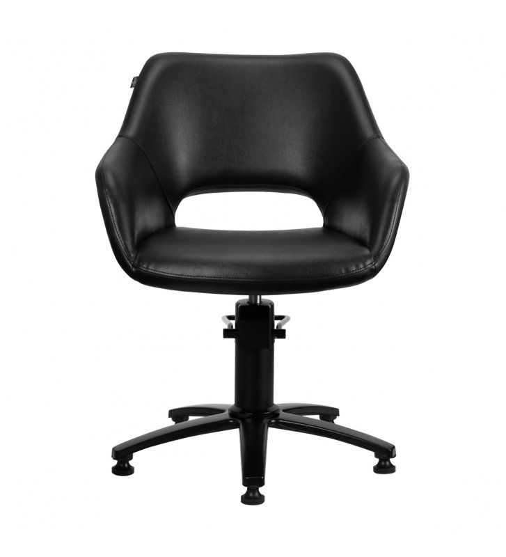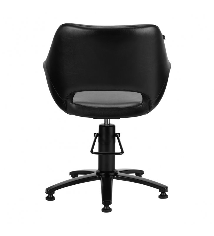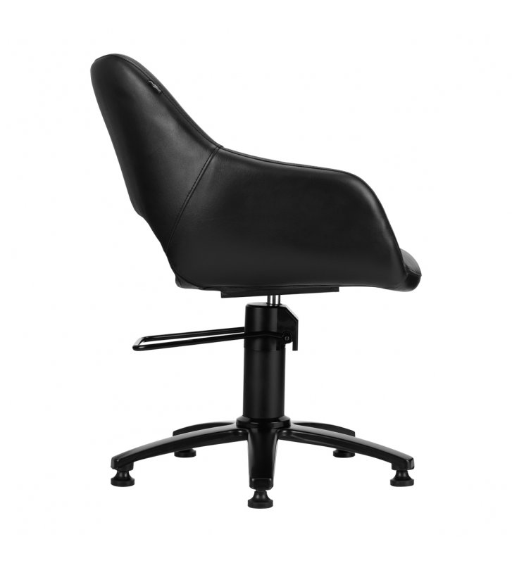 Modern black hairdressing chair. Set on a stable, five-star base. The seat is covered with high-quality eco-leather. Up-down adjustable armchair. A well-profiled seat ensures a comfortable position of the client during hairdressing treatments.