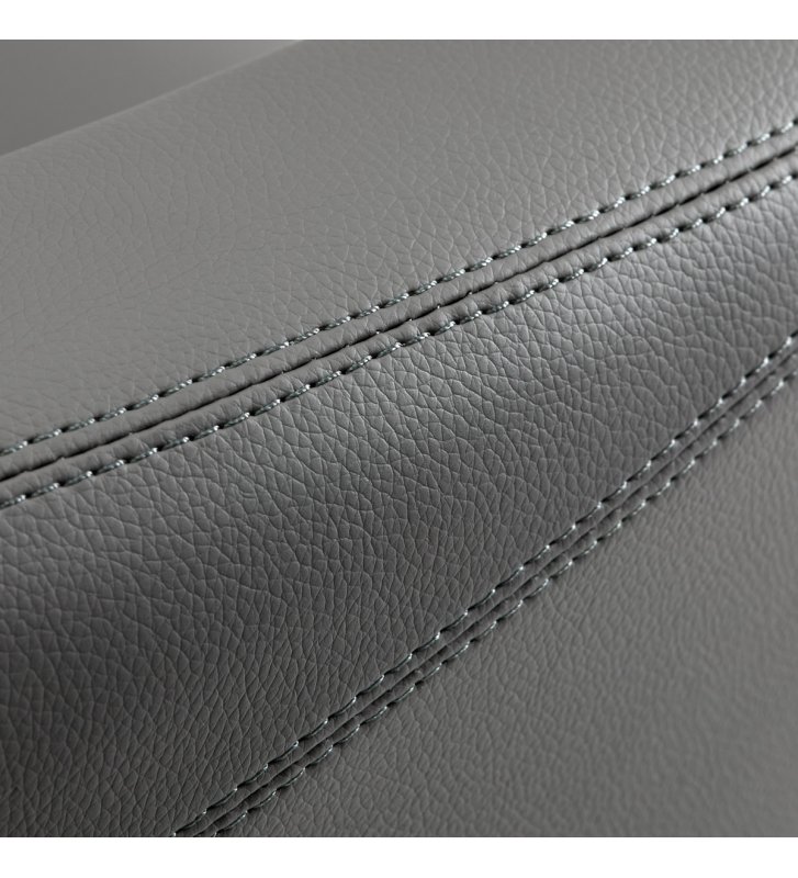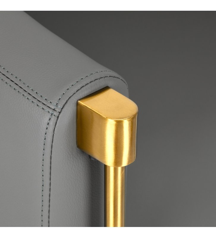 Fotel wypełniony jest pianką, która jest trwała i nie odkształca się, zapewniając komfortowe użytkowanie przez długi czas. Obicie wykonane jest z przyjemnej w dotyku imitacji skóry o specyficznej strukturze. Dzięki użyciu takiego materiału, sprzęt jest odporny na wilgoć, wytrzymały i łatwy w czyszczeniu. Pokrycie w odcieniach szarości oraz ozdobne powierzchnie metalowe lakierowane w barwach złota nadają mu wyraz ponadczasowej elegancji. Wyróżniające go klasyczne wykończenie sprawia, że będzie doskonale prezentować się w niemal każdej przestrzeni.