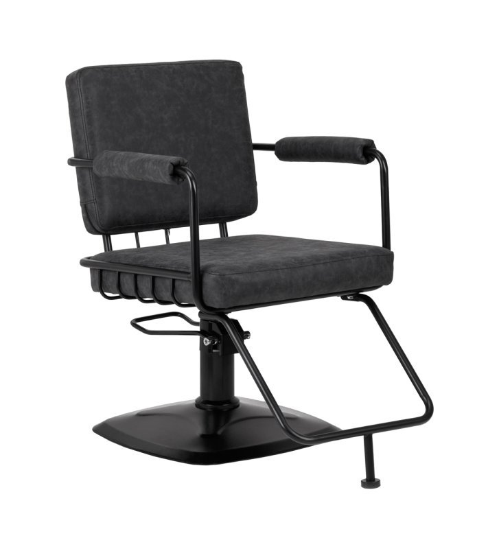 Solidna podstawa w kształcie kwadratu gwarantuje stabilność w trakcie użytkowania. Gładka powierzchnia sprawia, że element ten jest łatwy do utrzymania w czystości. Szerokie siedzisko z wypełnieniem z pianki zapewnia wysoki komfort użytkowania oraz wygodę nawet podczas wielogodzinnych zabiegów. Wyposażenie fotela w mechanizm pełnego obrotu sprawia, że praca fryzjera staje się bardziej efektywna i wygodna. Częściowo tapicerowane podłokietniki znajdują się na odpowiedniej wysokości, dzięki czemu pozwalają na prawidłowe ułożenie barków klienta – sprawia to, że nie chowa głowy w ramionach ani się nie garbi – wyraźnie ułatwiając precyzyjne wykonywanie zabiegów, w tym strzyżenia. Znacznym plusem jest dedykowany do tego modelu podnóżek, który zapewnia stabilne oparcie dla stóp użytkownika.