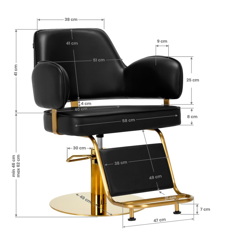 The comfortable piece of furniture is filled with durable, deformation-resistant foam , and the upholstery is made of pleasant-to-touch synthetic leather. The materials used ensure comfortable use of the furniture for a long time and make the equipment resistant to moisture, durable and easy to clean . Cover in shades of black and decorative elements in gold colors give it a timeless elegance . The B212G hairdressing chair is distinguished by a minimalist design, which gives it a unique character and makes the chair look great in many elegant salons.