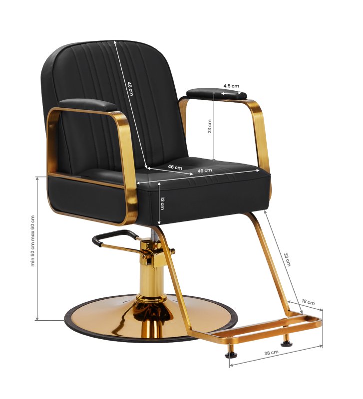 The full rotation mechanism of the chair makes the hairdresser's work more effective and comfortable. A solid, round base guarantees stability during use. The polished, smooth surface gives the element an elegant look and makes it easy to keep clean. A comfortable seat filled with soft foam ensures high comfort of use , even during many hours of treatments. Partially upholstered, metal armrests with an interesting shape allow for the correct positioning of the client's shoulders - this means that he does not bury his head in his shoulders or slouch - which clearly facilitates the performance of precise treatments , including haircuts.