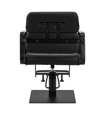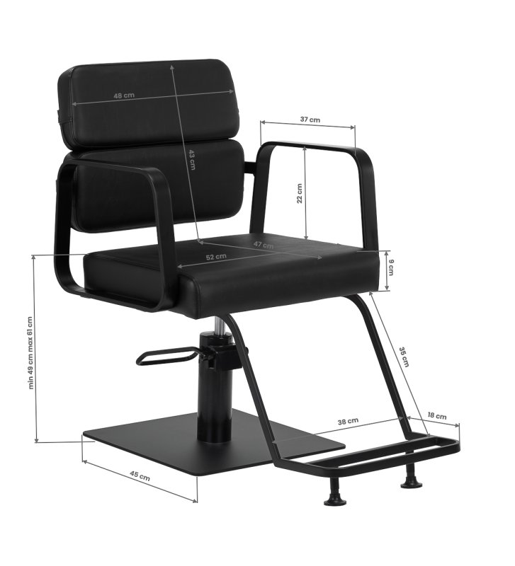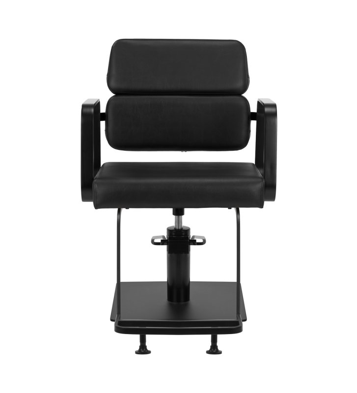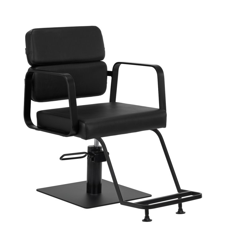 The full rotation mechanism of the chair makes the hairdresser's work more effective and comfortable . A solid, flat, square-shaped base guarantees stability during use. The matte-finished, smooth surface gives the element an elegant look and makes it easy to keep clean . A comfortable seat with foam filling ensures high comfort of use , even during many hours of treatments. Geometric, metal armrests allow for the correct positioning of the client's shoulders - this means that he does not bury his head in his shoulders or slouch - which makes it much easier to perform precise treatments , including haircuts. A stylish footrest dedicated to this model provides stable support for the user's feet .