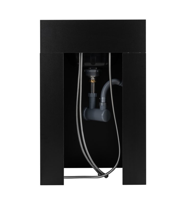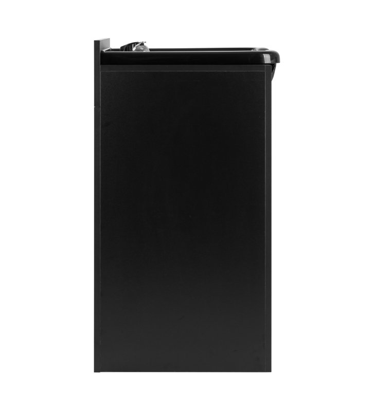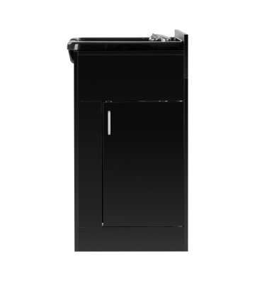 W zabudowie zastosowano boczne drzwiczki, które zapewniają łatwy dostęp do instalacji oraz umożliwiają przechowywanie najpotrzebniejszych produktów w dyskretny sposób. Tylny otwór na przyłącze wody pozwala na wygodne i estetyczne podłączenie stacji, jednocześnie umożliwiając ukrycie rur oraz odpływu, co sprzyja zachowaniu porządku i profesjonalnego wyglądu stanowiska. Kompaktowa forma mebla sprawia, że idealnie sprawdzi się zarówno w dużych salonach, jak i w mniejszych gabinetach.