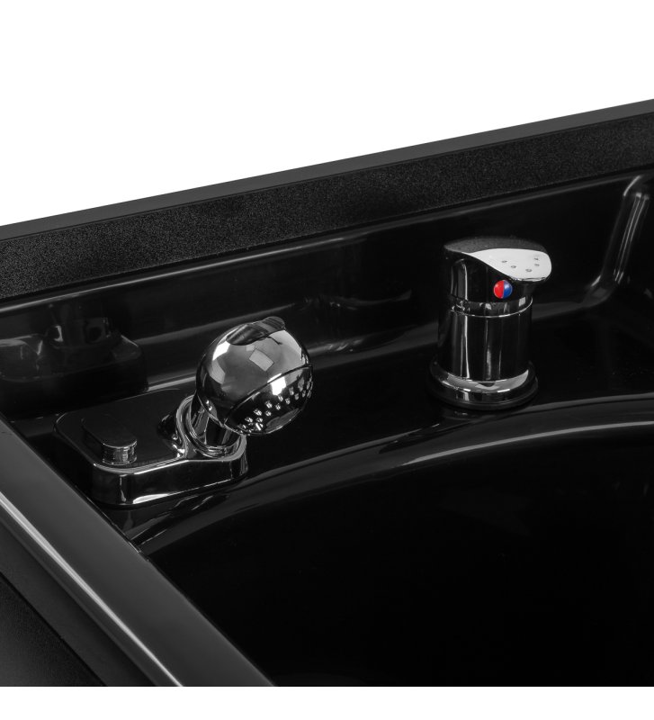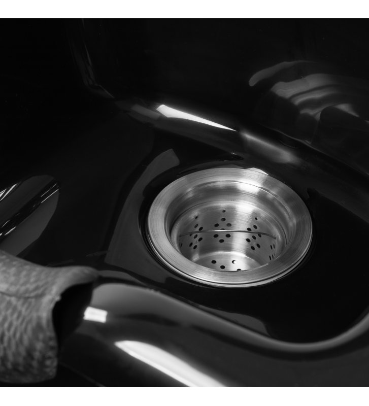 Głęboka misa w kolorze czerni została wykonana z wytrzymałego tworzywa sztucznego, co zapewnia jej odporność na uszkodzenia i łatwość utrzymania w czystości. Jej przemyślana konstrukcja skutecznie ogranicza rozchlapywanie wody i preparatów podczas mycia. Ergonomiczny kształt i wyprofilowany kołnierz z silikonową nakładką zapewniają klientowi wygodne ułożenie głowy. Praktyczne miejsce na słuchawkę natryskową sprzyja lepszej organizacji stanowiska, a korek z sitkiem ułatwia kontrolę przepływu wody i utrzymanie czystości oraz higieny.