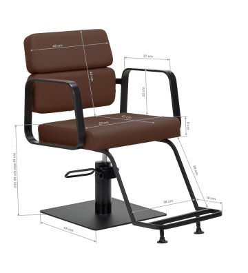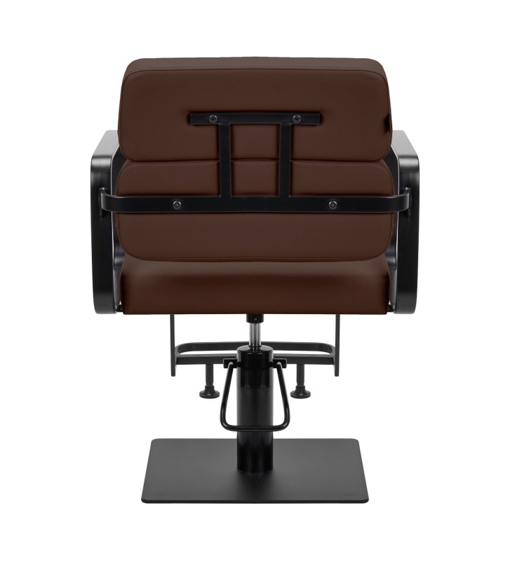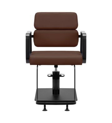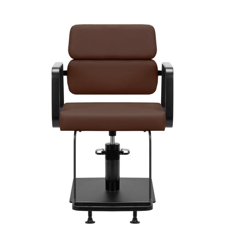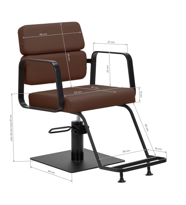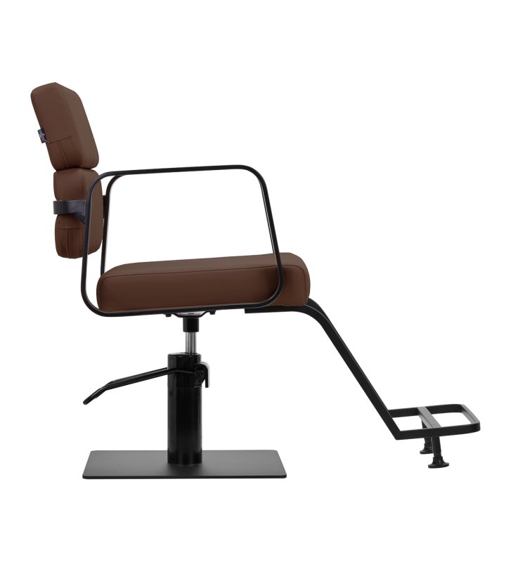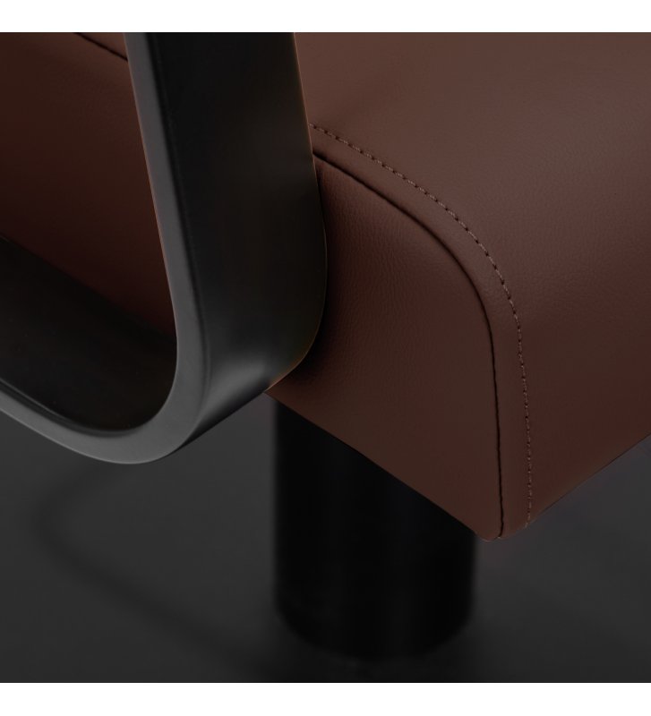 Mechanizm pełnego obrotu, w który jest wyposażony fotel, sprawia, że praca fryzjera staje się bardziej efektywna i wygodna. Solidna, płaska podstawa w kształcie kwadratu gwarantuje stabilność w trakcie użytkowania. Matowo wykończona, gładka powierzchnia nadaje elementowi elegancki wygląd i sprawia, że ten jest łatwy do utrzymania w czystości. Wygodne siedzisko z wypełnieniem z pianki zapewnia wysoki komfort użytkowania, nawet podczas wielogodzinnych zabiegów. Geometryczne, metalowe podłokietniki pozwalają na prawidłowe ułożenie barków klienta – sprawia to, że nie chowa głowy w ramionach ani się nie garbi – co wyraźnie ułatwia wykonywanie precyzyjnych zabiegów, w tym strzyżenia. Dedykowany do tego modelu stylowy podnóżek zapewnia stabilne oparcie dla stóp użytkownika.