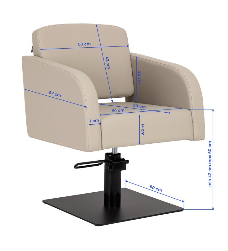 Trwały podnośnik hydrauliczny umożliwia płynną regulację wysokości siedziska w zakresie od 42 do 60 cm – także w momencie, gdy klient znajduje się na fotelu. Dzięki temu praca staje się ergonomiczna, a pozycję można łatwo dopasować zarówno do wzrostu klienta, jak i fryzjera. Wygodne oparcie ułatwia przyjęcie komfortowej pozycji i zapewnia stabilne podparcie pleców, co jest istotne zwłaszcza podczas długotrwałych zabiegów, podnosząc jednocześnie komfort i zadowolenie klienta.