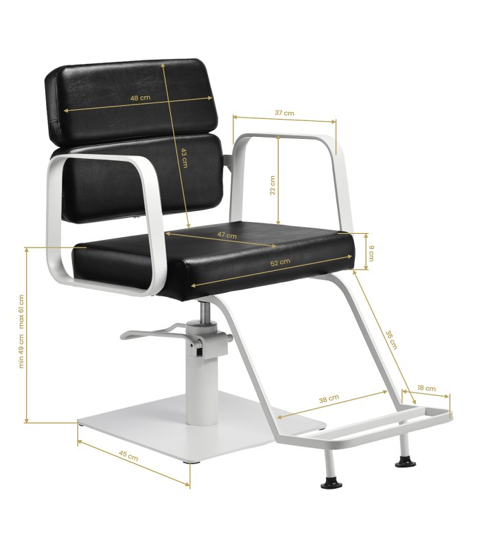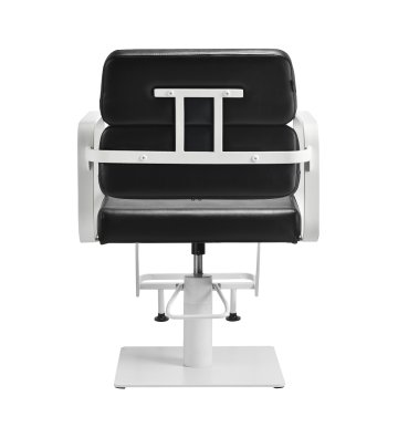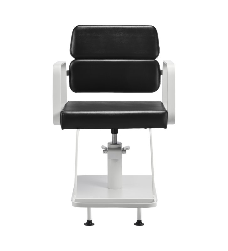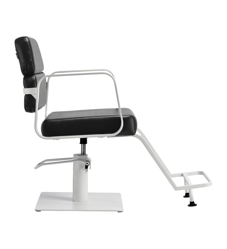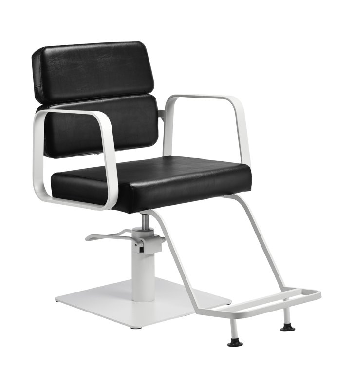 Mechanizm pełnego obrotu, w który jest wyposażony fotel, sprawia, że praca fryzjera staje się bardziej efektywna i wygodna. Solidna, płaska podstawa w kształcie kwadratu gwarantuje stabilność w trakcie użytkowania. Matowo wykończona, gładka powierzchnia nadaje elementowi elegancki wygląd i sprawia, że ten jest łatwy do utrzymania w czystości. Wygodne siedzisko z wypełnieniem z pianki zapewnia wysoki komfort użytkowania, nawet podczas wielogodzinnych zabiegów. Geometryczne, metalowe podłokietniki pozwalają na prawidłowe ułożenie barków klienta – sprawia to, że nie chowa głowy w ramionach ani się nie garbi – co wyraźnie ułatwia wykonywanie precyzyjnych zabiegów, w tym strzyżenia. Dedykowany do tego modelu stylowy podnóżek zapewnia stabilne oparcie dla stóp użytkownika.