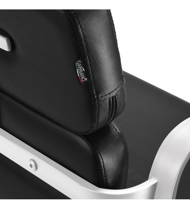 Wypełnienie z trwałej, odpornej na odkształcenia pianki oraz obicie wykonane z przyjemnej w dotyku skóry syntetycznej zapewniają trwałość mebla i jego komfortowe użytkowanie przez długi czas. Sprawiają również, że sprzęt jest odporny na wilgoć, wytrzymały oraz łatwy do czyszczenia. Pokrycie w odcieniach czerni nadaje mu wyjątkowego charakteru. Sprzęt wyróżnia nowoczesny design, który sprawia, że fotel będzie doskonale prezentować się w wielu profesjonalnych salonach.
