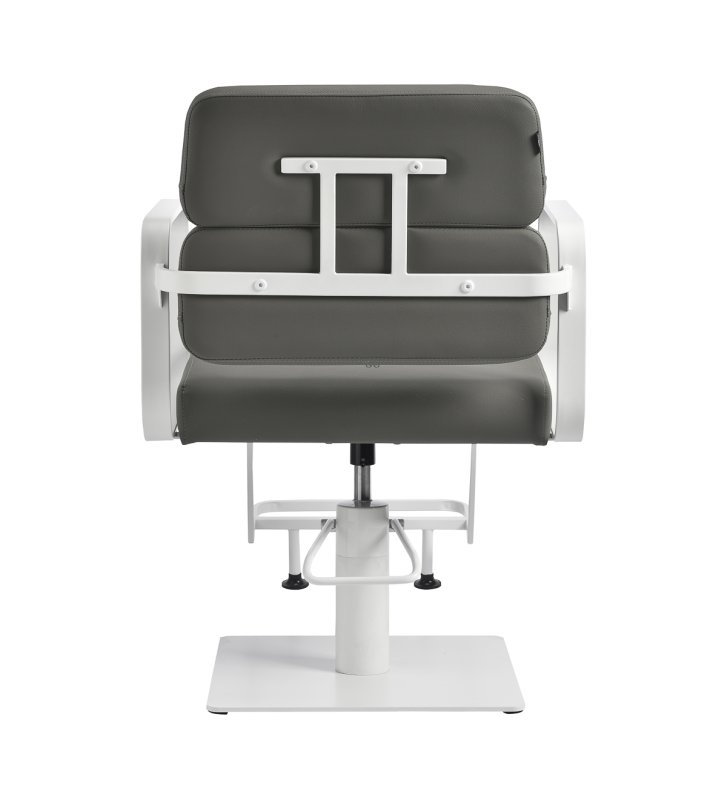 Mechanizm pełnego obrotu, w który jest wyposażony fotel, sprawia, że praca fryzjera staje się bardziej efektywna i wygodna. Solidna, płaska podstawa w kształcie kwadratu gwarantuje stabilność w trakcie użytkowania. Matowo wykończona, gładka powierzchnia nadaje elementowi elegancki wygląd i sprawia, że ten jest łatwy do utrzymania w czystości. Wygodne siedzisko z wypełnieniem z pianki zapewnia wysoki komfort użytkowania, nawet podczas wielogodzinnych zabiegów. Geometryczne, metalowe podłokietniki pozwalają na prawidłowe ułożenie barków klienta – sprawia to, że nie chowa głowy w ramionach ani się nie garbi – co wyraźnie ułatwia wykonywanie precyzyjnych zabiegów, w tym strzyżenia. Dedykowany do tego modelu stylowy podnóżek zapewnia stabilne oparcie dla stóp użytkownika.