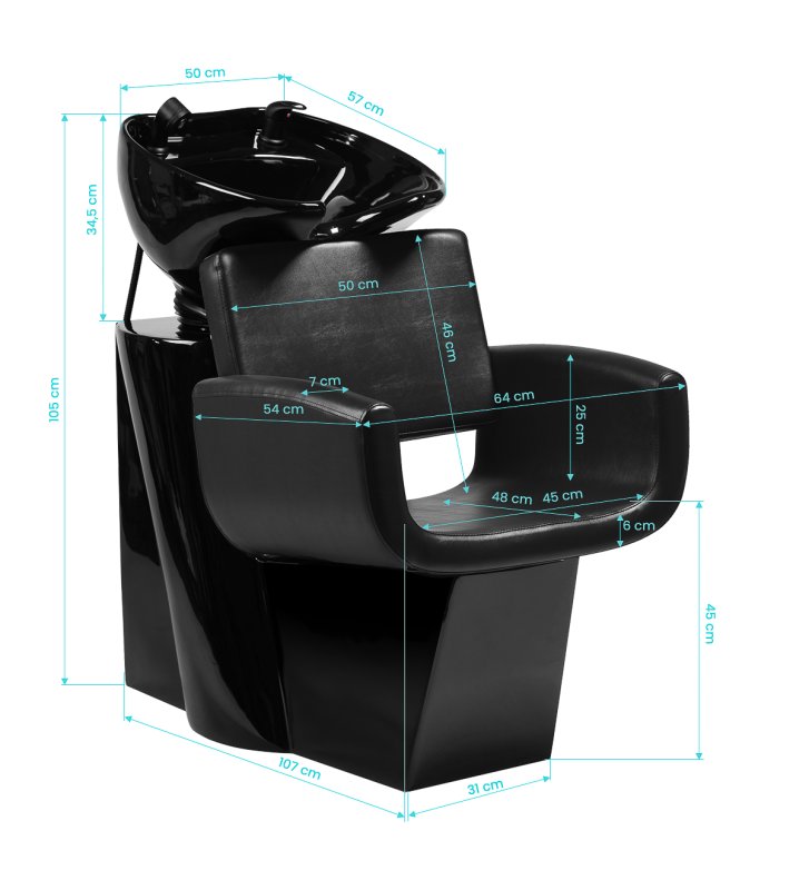 Minimalistyczny fotel o charakterystycznie zaokrąglonym siedzisku łączy prostotę formy z wysokim komfortem użytkowania. Oparcie o optymalnym kącie nachylenia wspiera naturalną pozycję ciała. Tapicerka wykonana z wysokiej jakości skóry syntetycznej w odcieniach czerni jest odporna na zużycie i łatwa do utrzymania w czystości. Nowoczesna linia mebla podkreśla elegancki charakter myjni oraz doskonale komponuje się z wystrojem salonu. W zestawie znajduje się kompletna armatura o matowym wykończeniu w odcieniach czerni, w tym bateria, słuchawka prysznicowa oraz dedykowane węże, aby zapewnić całkowity zestaw narzędzi do pracy.
