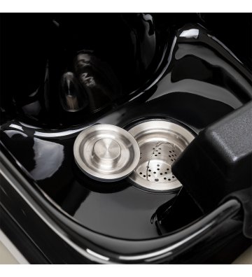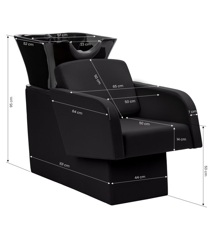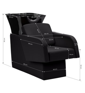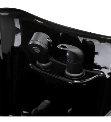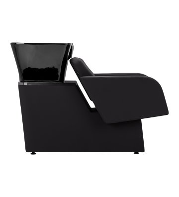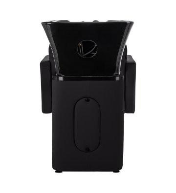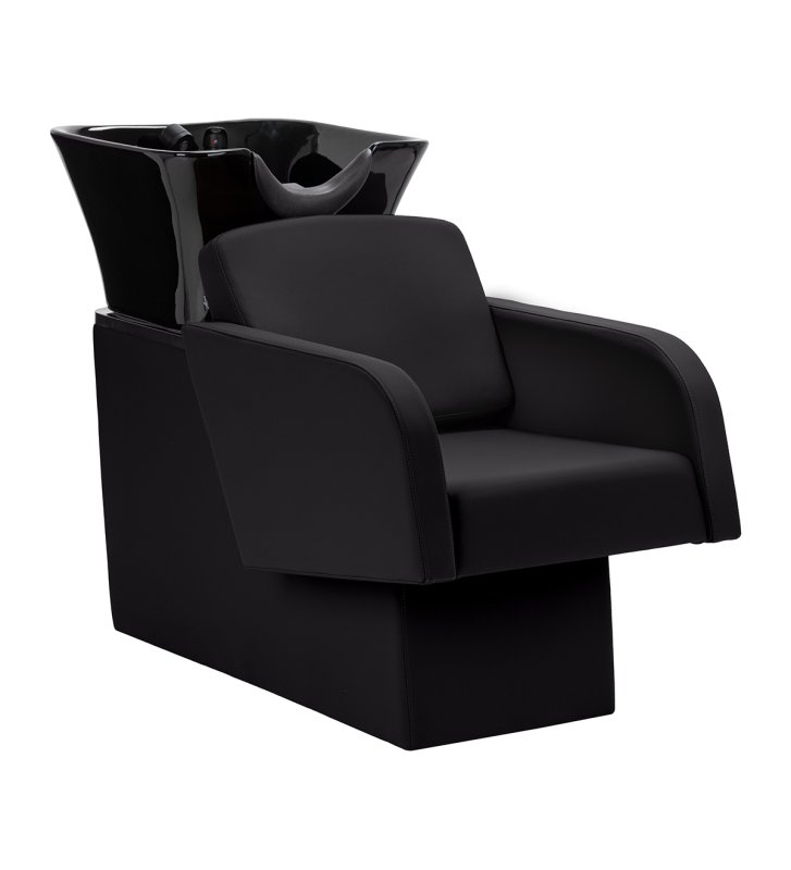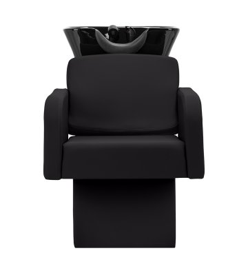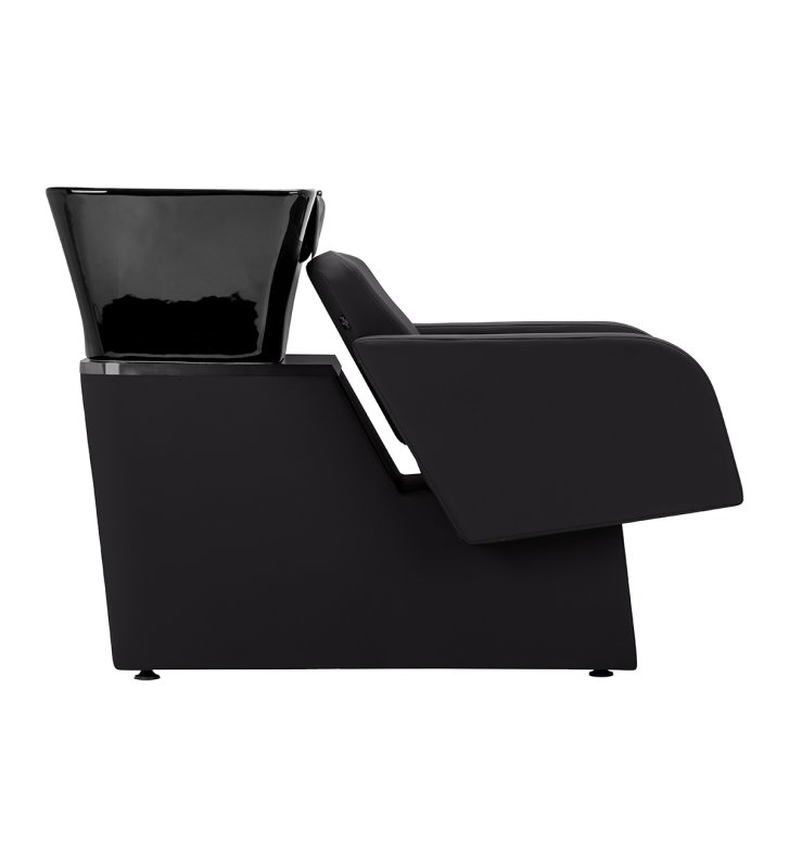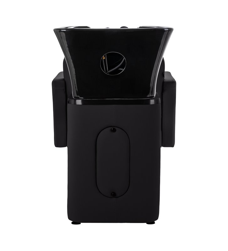 Ceramiczna misa umywalki w odcieniach czerni, o nowoczesnym kształcie i odpowiedniej głębokości, skutecznie zapobiega rozchlapywaniu wody oraz produktów używanych podczas zabiegów, umożliwiając komfortowe i efektywne wykonywanie szerokiej gamy usług. Odpowiednio wyprofilowany kołnierz oraz nachylone oparcie zapewniają wygodę i wsparcie podczas mycia włosów, a nakładka z tworzywa sztucznego w odcieniach czerni chroni klienta przed chłodem ceramicznej powierzchni, gwarantując przyjemne doznania w trakcie zabiegu.