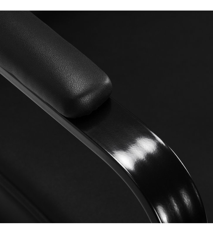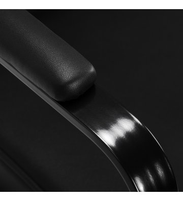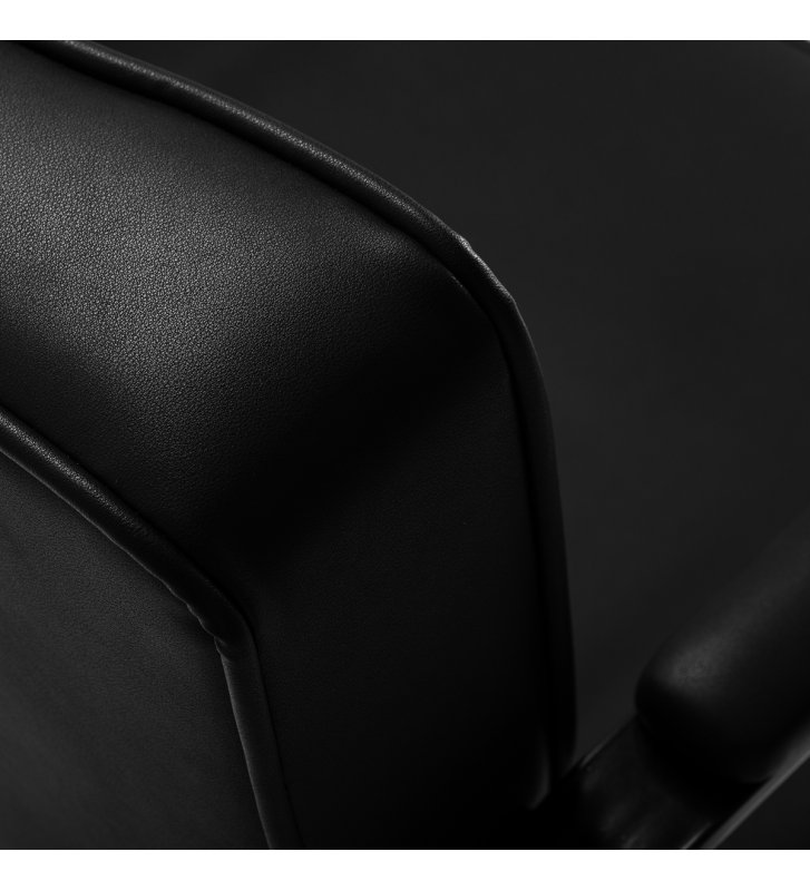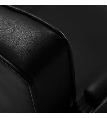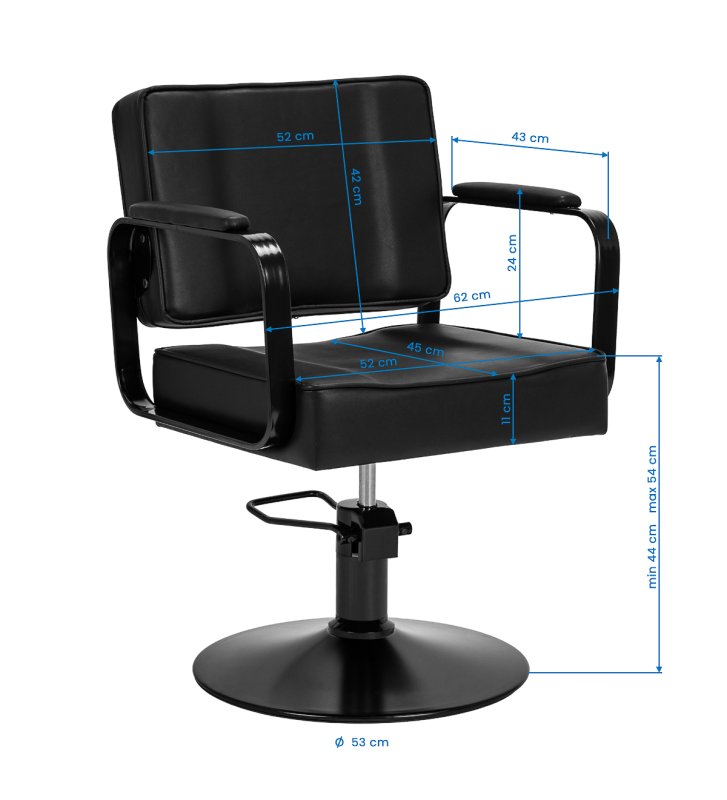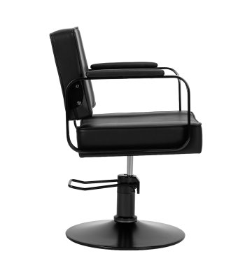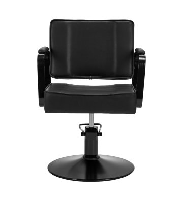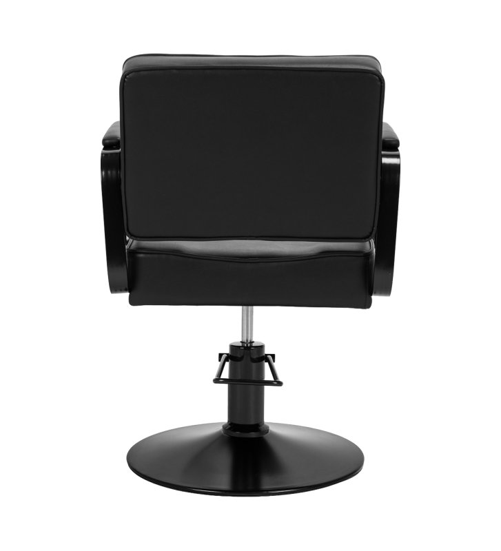 Wytrzymała konstrukcja i obicie z czarnej skóry syntetycznej zapewniają odporność na wilgoć, trwałość i solidność fotela. Okrągła podstawa w tym samym odcieniu gwarantuje stabilność i bezpieczeństwo użytkowania. Minimalistyczny design sprawia, że fotel doskonale komponuje się z różnymi stylami wnętrz salonów fryzjerskich, wprowadzając elegancki i nowoczesny akcent.