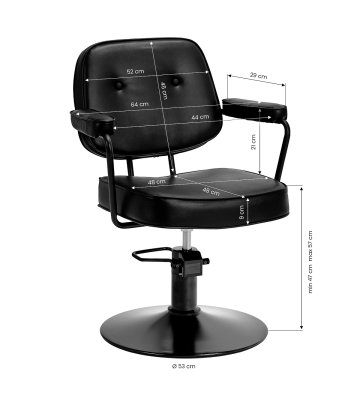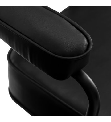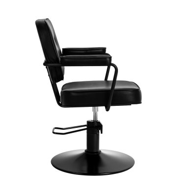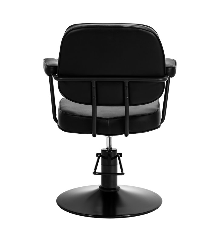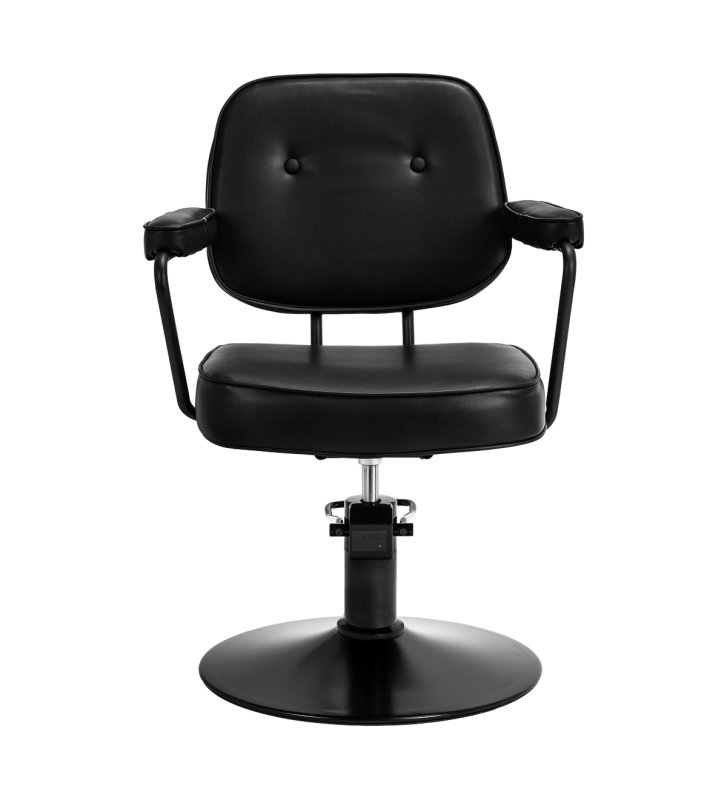 Prosty, minimalistyczny design łączy nowoczesny charakter z trwałością i stabilnością. Skóra syntetyczna w odcieniach czerni zapewnia odporność na wilgoć, solidność oraz długowieczność fotela. Czarna, okrągła podstawa gwarantuje stabilność i wytrzymałość, a staranne detale świadczą o wysokiej jakości wykonania. Minimalistyczna czerń w połączeniu z nowoczesnym stylem sprawia, że fotel doskonale komponuje się z różnymi aranżacjami salonów fryzjerskich, wprowadzając elegancki i stylowy akcent.