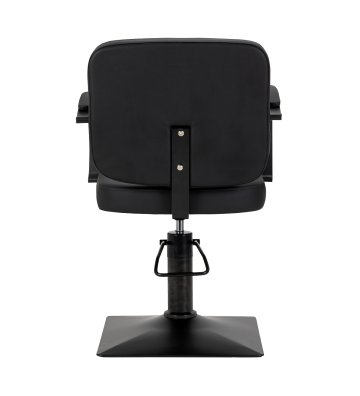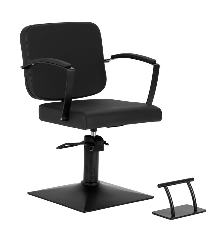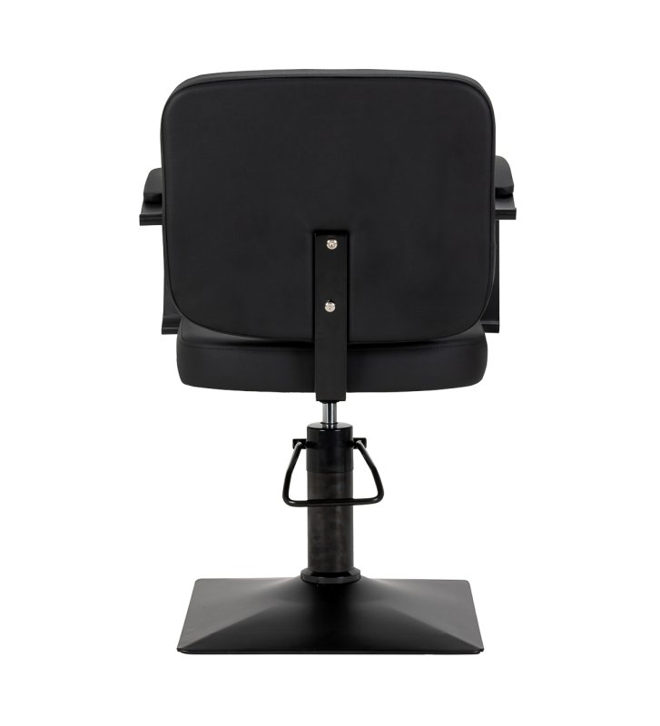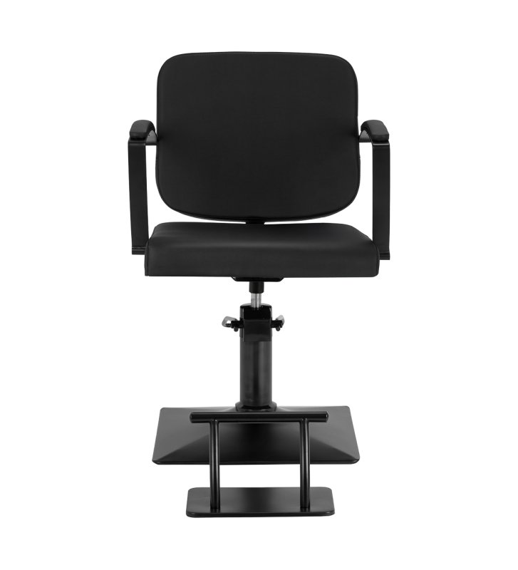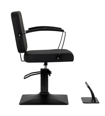 Solidna, kwadratowa podstawa fotela zapewnia stabilność, a jej gładka powierzchnia ułatwia utrzymanie czystości. Estetyczne, tapicerowane podłokietniki o ergonomicznym kształcie umieszczono na optymalnej wysokości, dzięki czemu klient przyjmuje naturalną, prawidłową pozycję. Zwiększa to komfort oraz wspiera swobodną postawę, co przekłada się na płynniejszy przebieg zabiegów oraz umożliwia fryzjerowi precyzyjną pracę na każdym etapie usługi.