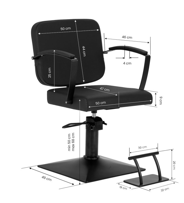 Trwały podnośnik hydrauliczny zapewnia regulację wysokości siedziska w zakresie 50–68 cm, również w trakcie użytkowania, co pozwala ergonomicznie ustawić fotel względem wzrostu klienta i specjalisty. Odpowiednio wyprofilowane oparcie zapewnia wygodną pozycję, co ma szczególne znaczenie przy dłuższych zabiegach. Dodatkowo fotel wyposażony jest w dopasowany podnóżek z antypoślizgową podstawą, który stabilnie podpiera stopy klienta, zwiększając komfort przez cały czas trwania zabiegu.