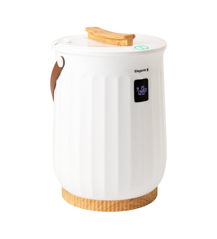 The elegant Elegante E18 towel warmer allows you to heat two large towels at the same time. Thanks to its unique bucket-shaped design, the device ensures even heat distribution over the entire surface during each use. For greater comfort of use , it is equipped with a display, a carrying strap and a scent disc holder .