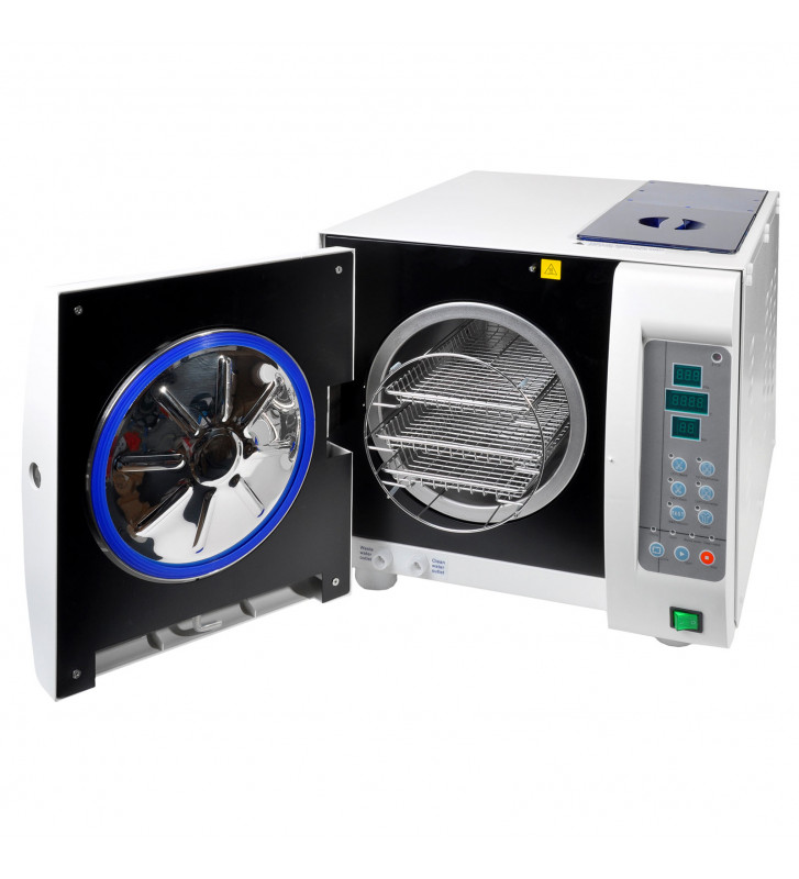 Medical autoclave Mona 18 liters class B with a thermal printer. One of the most advanced pressure steam sterilizers. Suitable for the sterilization of practically any type of material, e.g. catheters, needles, endoscopes, specula, dental tips, files, scissors, towels, brushes, etc.