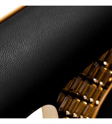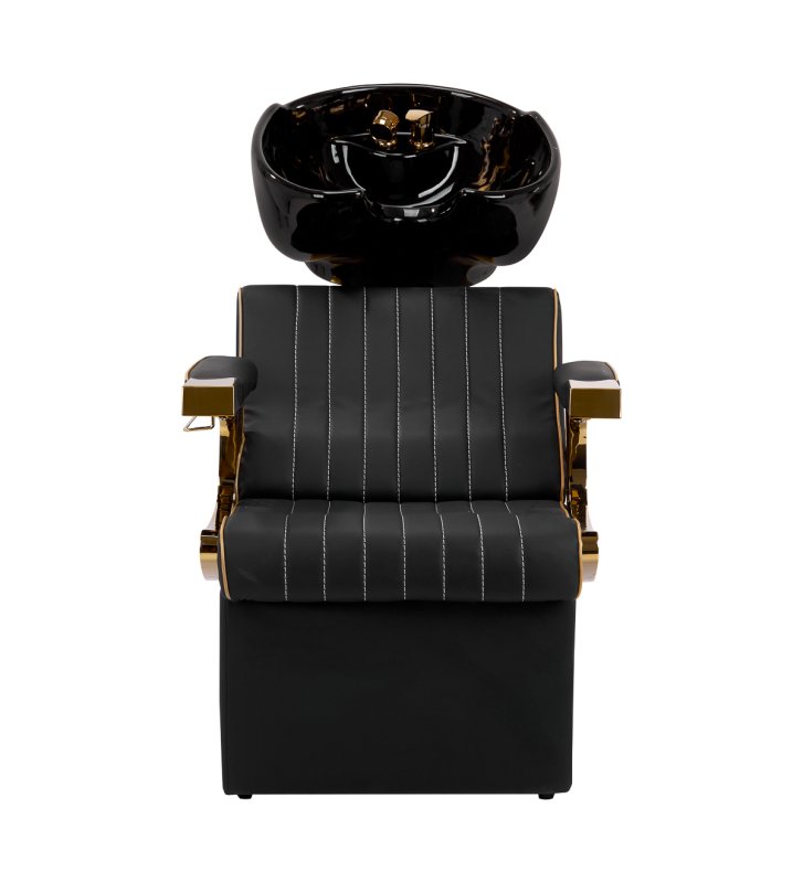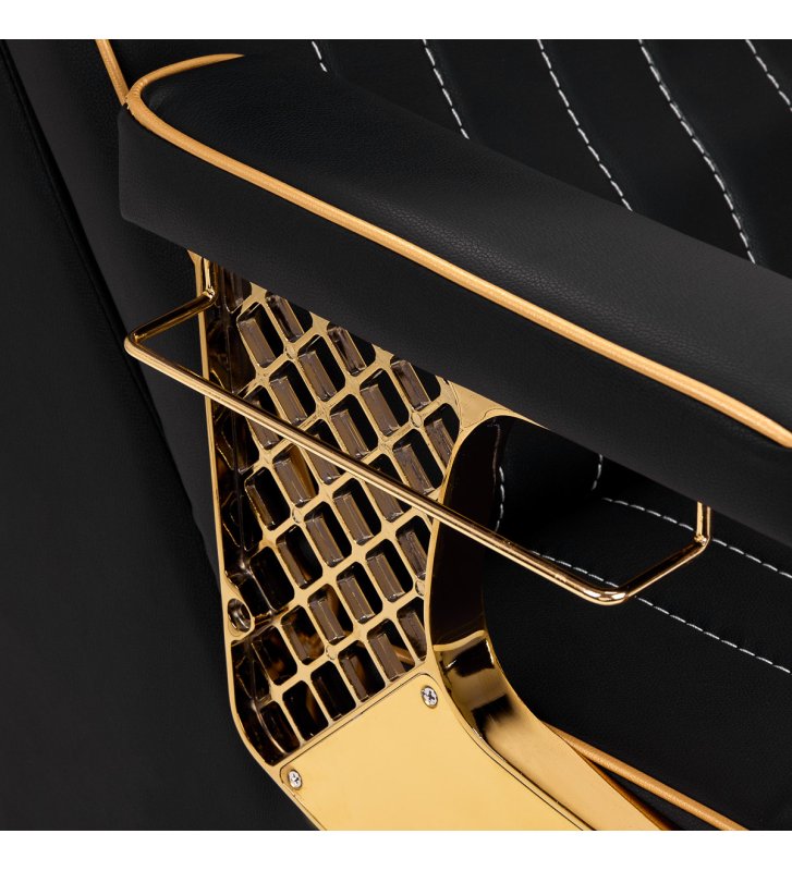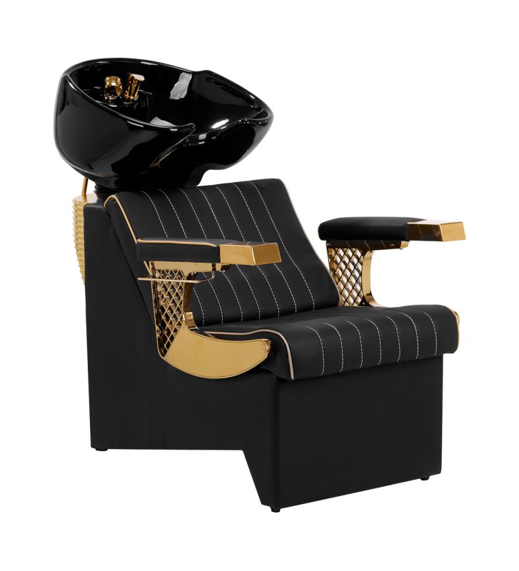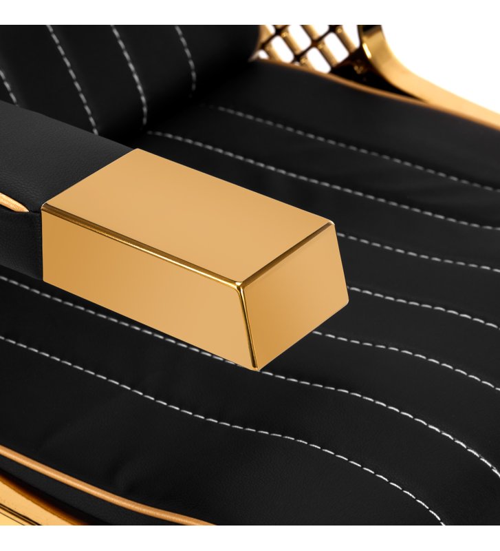 The suitably profiled armchair filled with durable foam provides lumbar support , and therefore high comfort of use. Partially upholstered, decorated armrests allow for the correct positioning of the client's arms and shoulders . The synthetic leather cover in shades of black with aesthetic white stitching ensures long-term durability and ease of cleaning . The original, elegant appearance of the car wash gives the interior a unique expression , and the interestingly profiled base and legs add stability. The set includes complete fittings in shades of gold, including a faucet, shower head and dedicated hoses, to provide a complete set of tools for work.