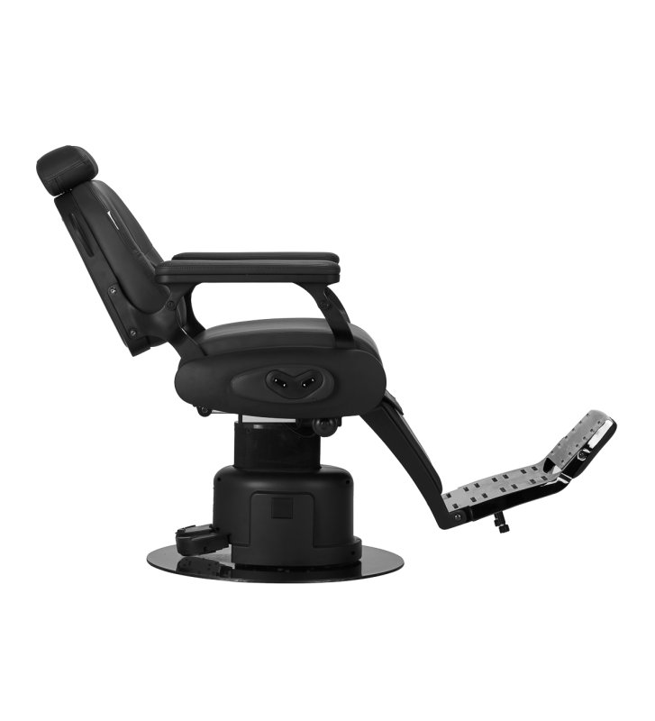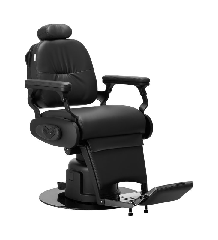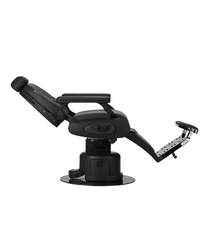 Elektryczny system sterowania gwarantuje szerokie możliwości regulacji. Umożliwia precyzyjne dostosowanie wysokości siedziska w zakresie 58-72 cm oraz niemal pełen obrót, co zapewnia barberom znaczną swobodę ruchu, nawet w mniejszych przestrzeniach. Sterowanie odbywa się zarówno za pomocą przycisków umieszczonych z boku fotela, jak i za pomocą sterowania nożnego, co daje dodatkową elastyczność podczas pracy. Podnoszenie oparcia i podnóżka jest również sterowane elektrycznie, co pozwala na szybkie i płynne dostosowanie pozycji klienta do wykonywanego zabiegu.