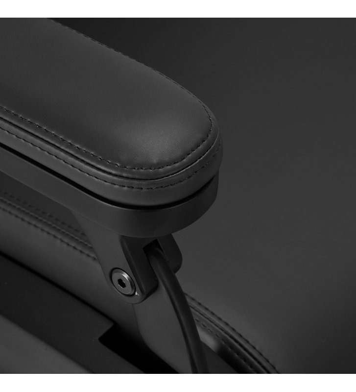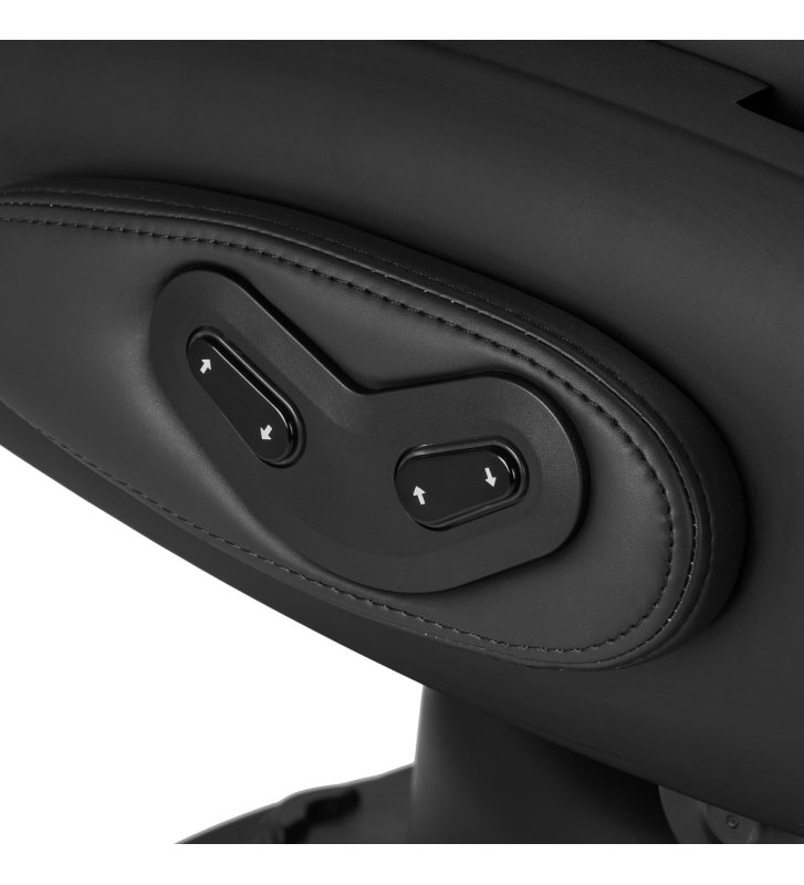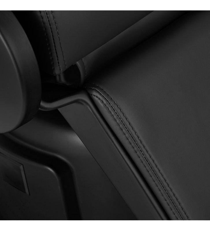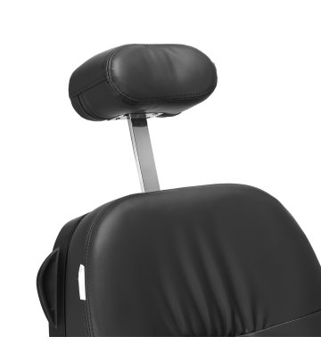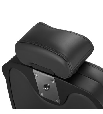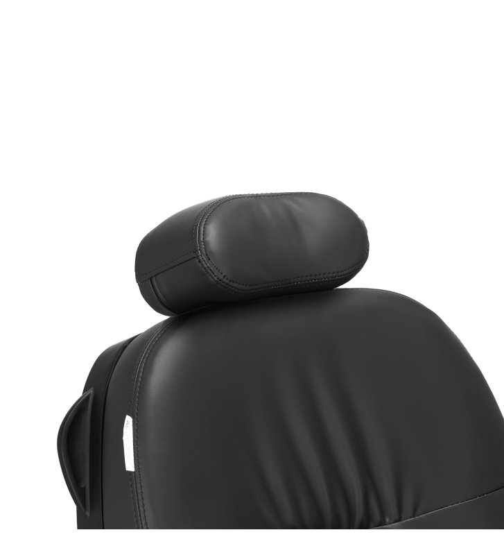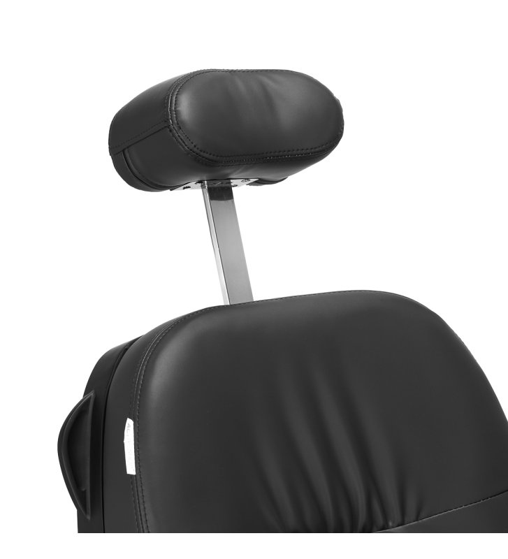 Wyprofilowane oparcie i wysuwany o 30 cm zagłówek gwarantują komfortowe podparcie pleców i głowy, co jest szczególnie istotne podczas dłuższych zabiegów. Mechanizm obrotu sprawia, że praca staje się bardziej efektywna, ułatwiając dostęp do klienta z każdej strony, nawet w niewielkich przestrzeniach. Fotel rozkłada się do półleżącej pozycji. Takie ustawienie gwarantuje lepszy dostęp podczas niektórych usług. Podłokietniki umieszczone na odpowiedniej wysokości umożliwiają prawidłowe ułożenie barków klienta – sprawia to, że nie chowa głowy w ramionach ani się nie garbi – znacząco ułatwiając wykonywanie precyzyjnych zabiegów.
