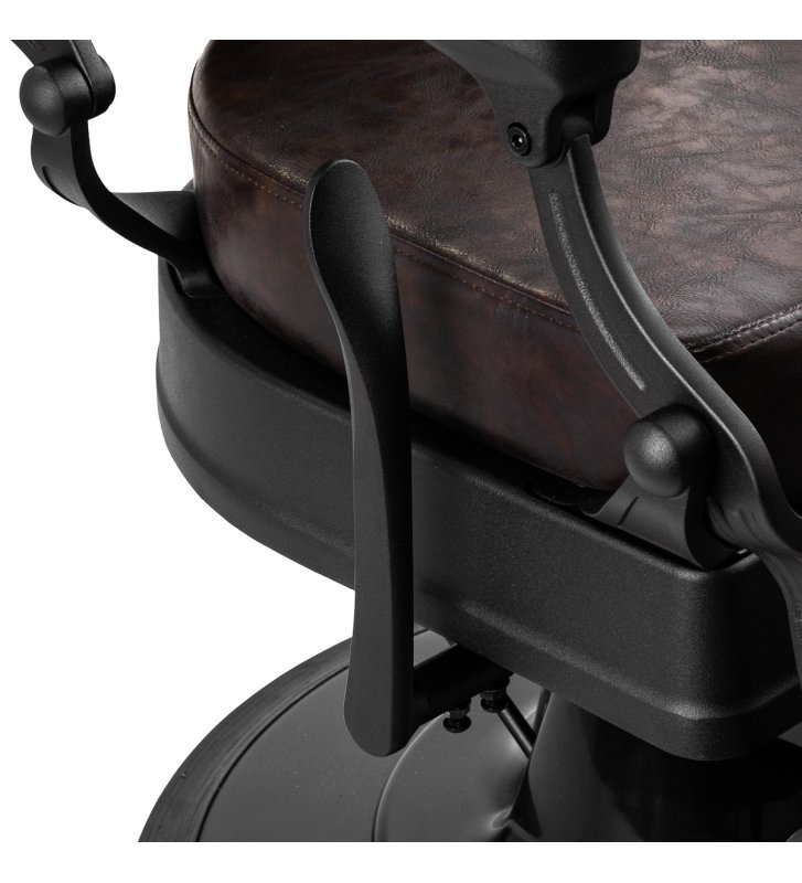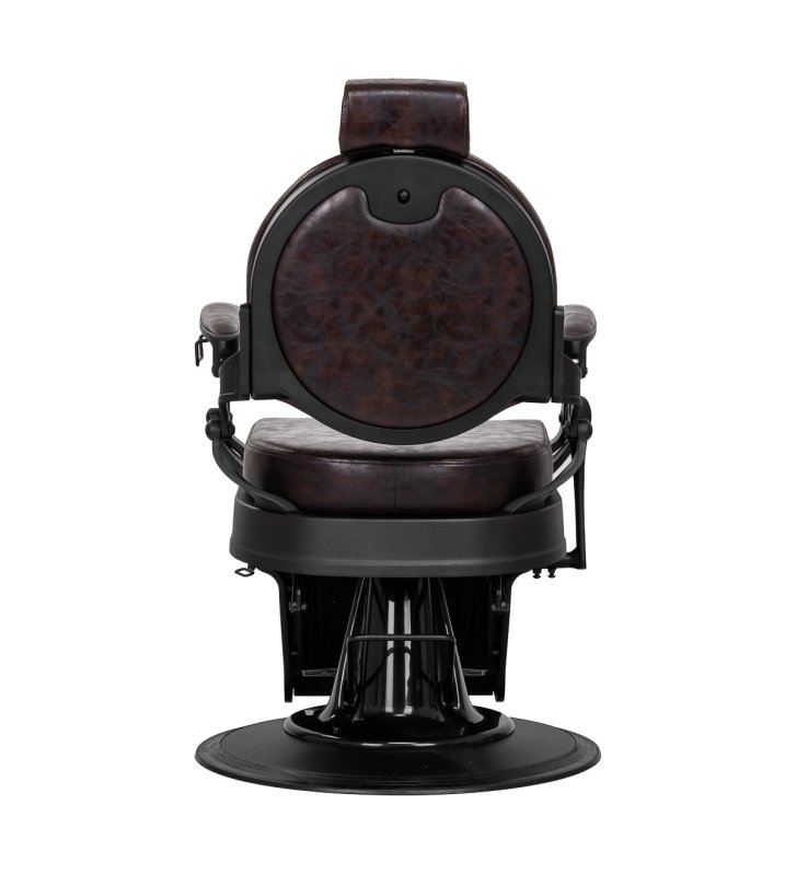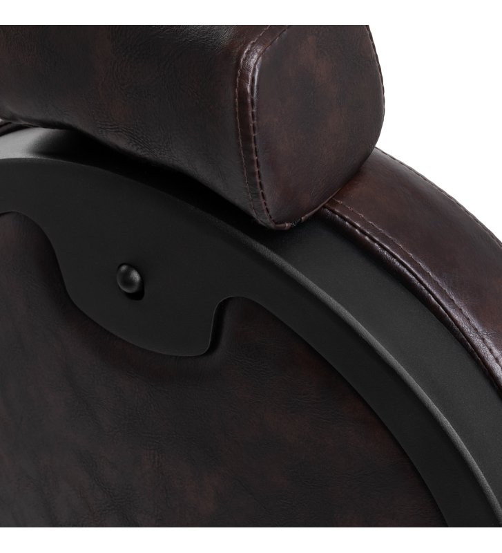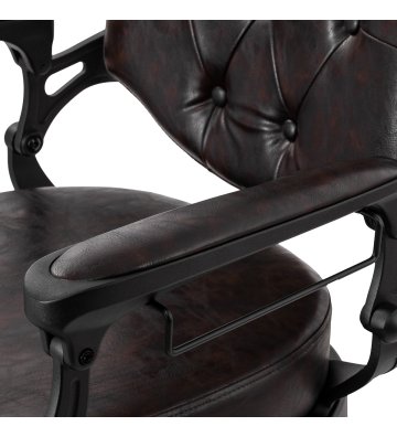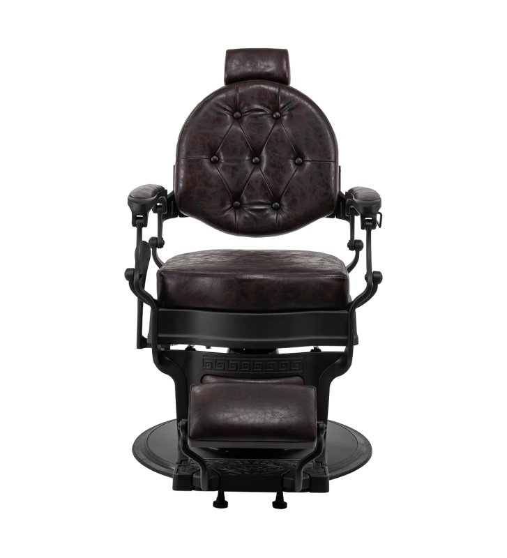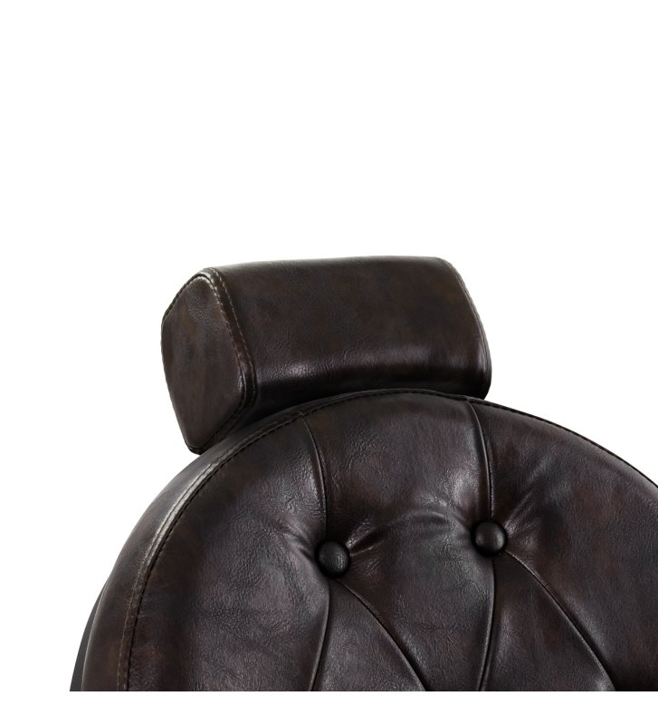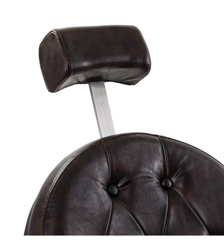 Solidna konstrukcja podstawy zapewnia stabilność oraz wysoki komfort użytkowania. Wypełnienie siedziska z trwałej, odpornej na odkształcenia pianki oraz obicie wykonane z przyjemnej w dotyku skóry syntetycznej o półmatowym wykończeniu zapewniają trwałość mebla i jego komfortowe użytkowanie przez długi czas. Sprawiają również, że sprzęt jest odporny na wilgoć, wytrzymały oraz łatwy do czyszczenia. Pokrycie w odcieniach brązu z pikowaniem i ozdobnymi guzikami nadaje mu wyjątkowego charakteru. Fotel o charakterystycznym designie, nawiązującym do stylu vintage, doskonale wpasowuje się w klimat salonów barberskich, podkreślając ich wyjątkową atmosferę.