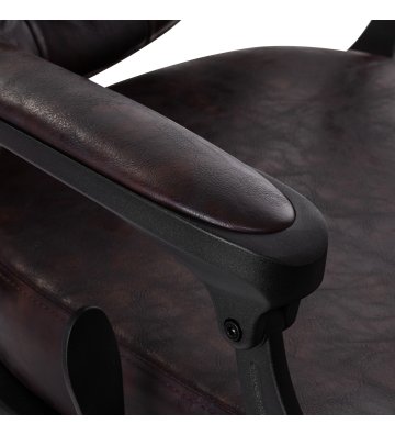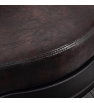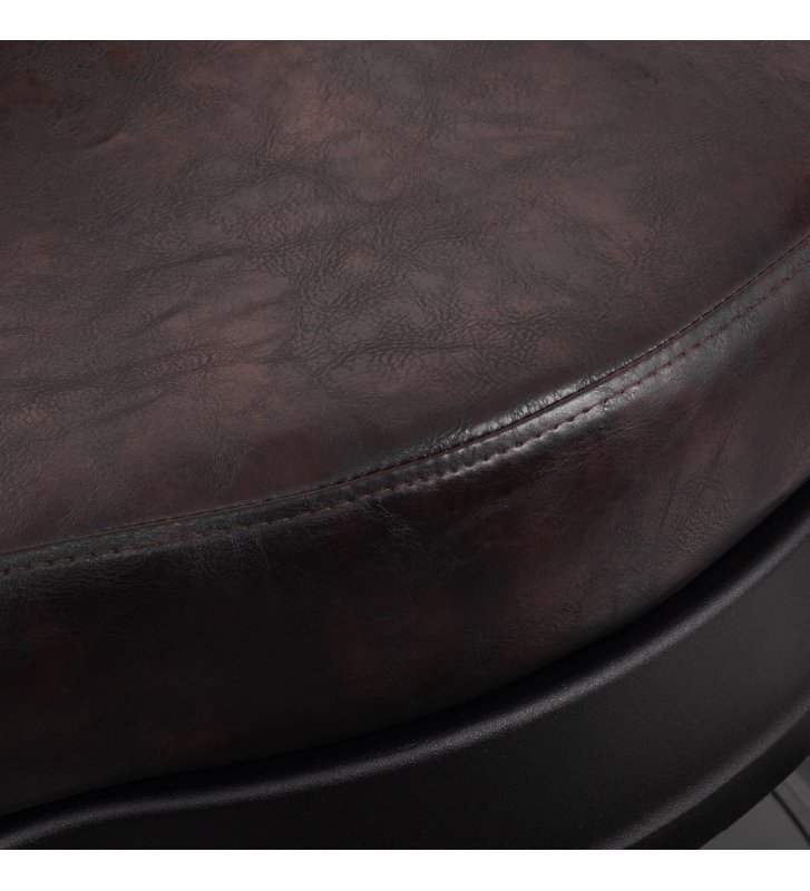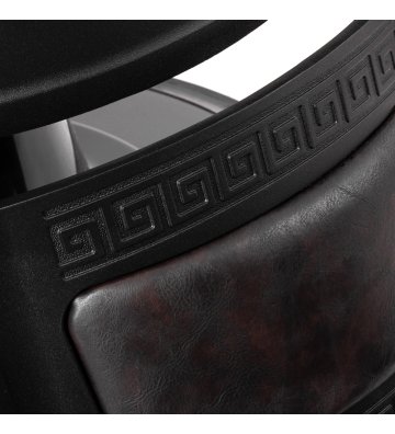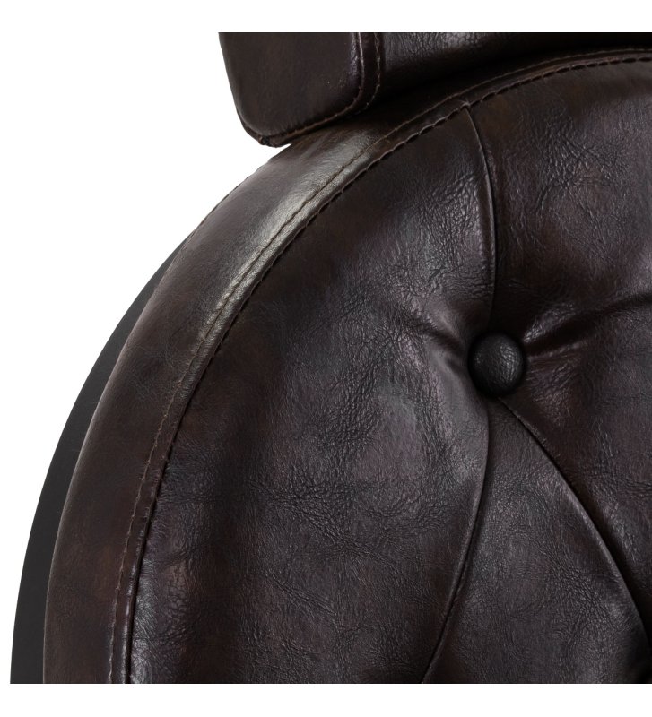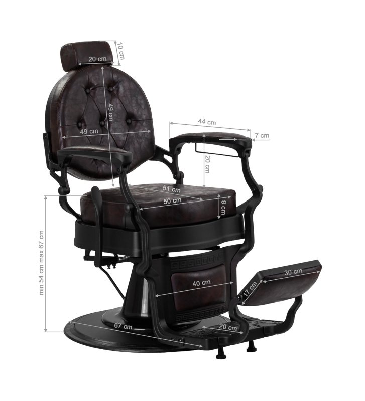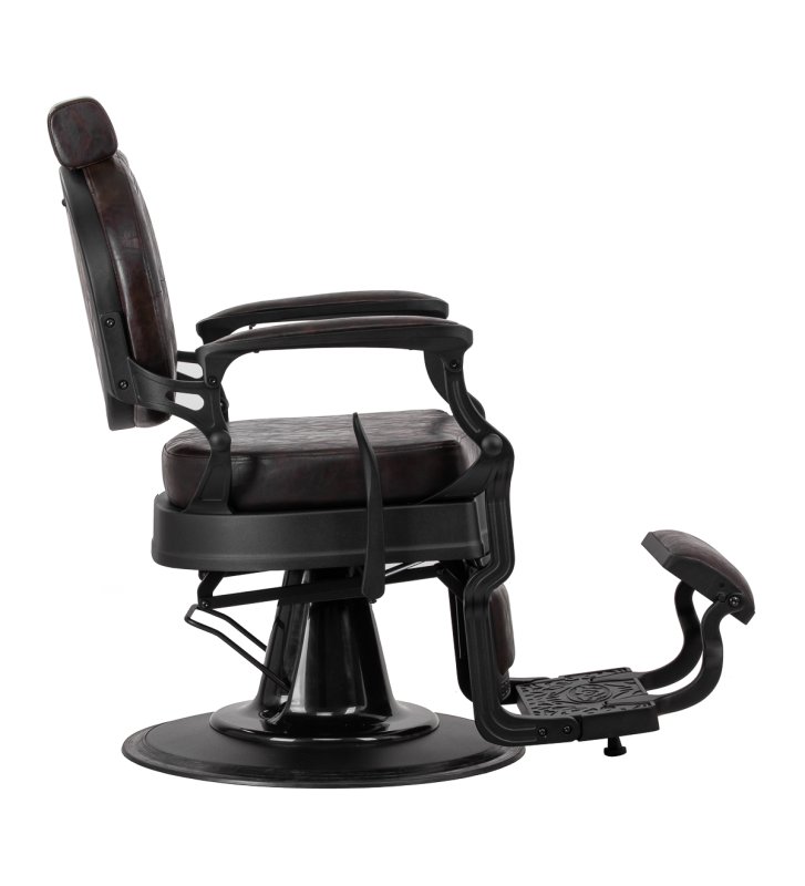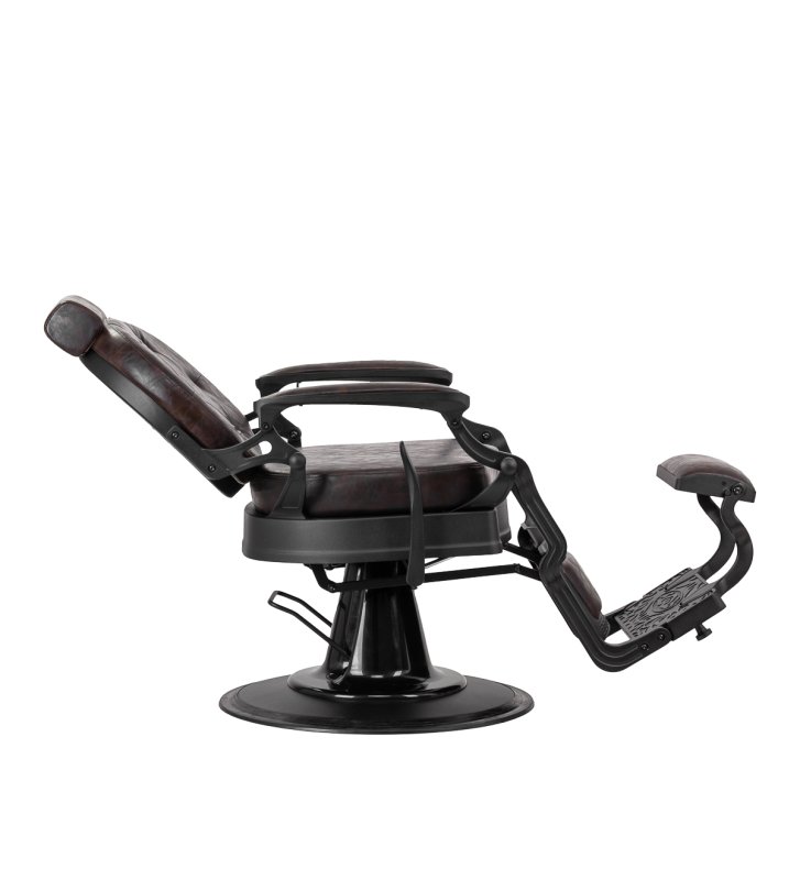 Solidna konstrukcja podstawy zapewnia stabilność oraz wysoki komfort użytkowania. Wypełnienie siedziska z trwałej, odpornej na odkształcenia pianki oraz obicie wykonane z przyjemnej w dotyku skóry syntetycznej o półmatowym wykończeniu zapewniają trwałość mebla i jego komfortowe użytkowanie przez długi czas. Sprawiają również, że sprzęt jest odporny na wilgoć, wytrzymały oraz łatwy do czyszczenia. Pokrycie w odcieniach brązu z pikowaniem i ozdobnymi guzikami nadaje mu wyjątkowego charakteru. Fotel o charakterystycznym designie, nawiązującym do stylu vintage, doskonale wpasowuje się w klimat salonów barberskich, podkreślając ich wyjątkową atmosferę.