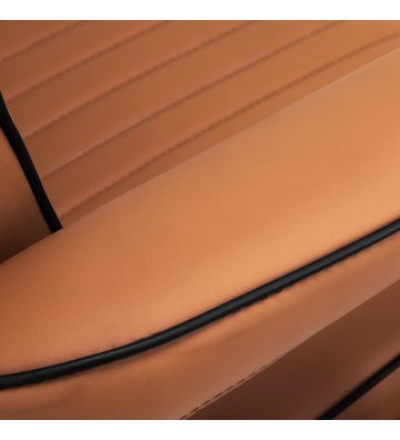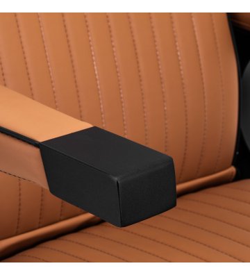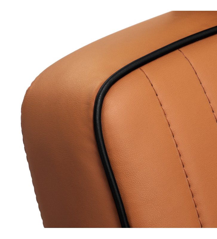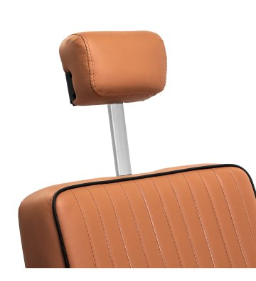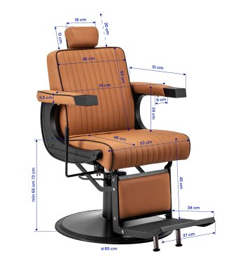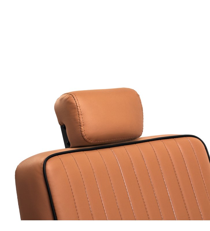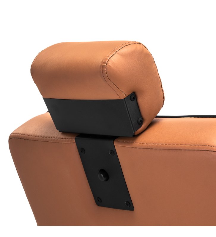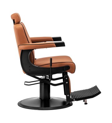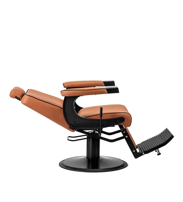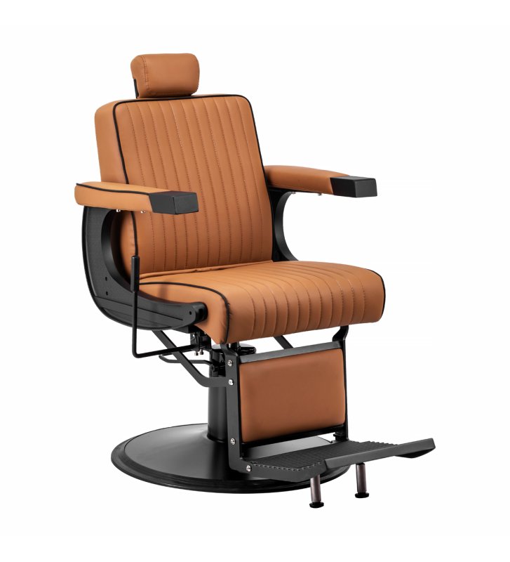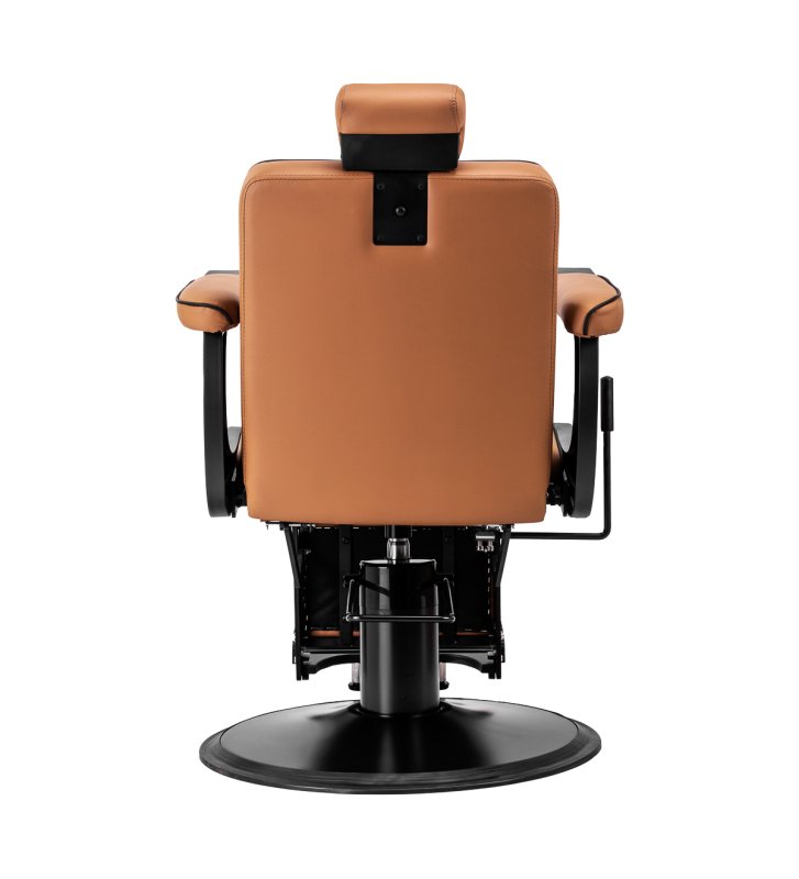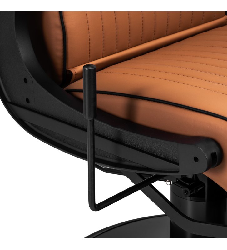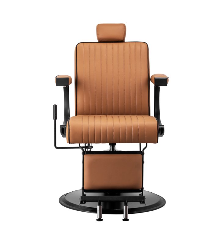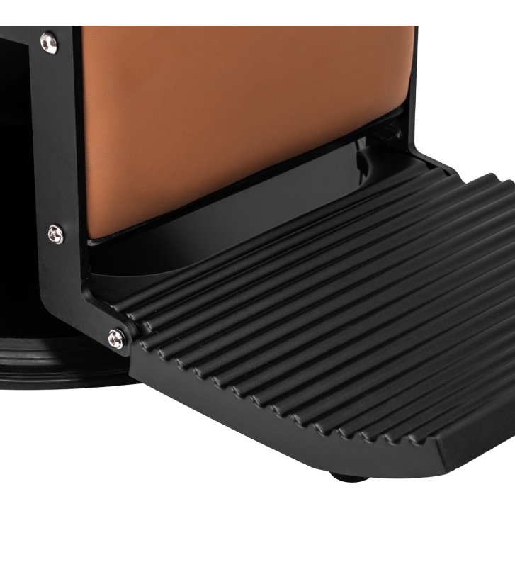 Solidna konstrukcja podstawy zapewnia stabilność oraz wysoki komfort użytkowania. Siedzisko wypełnione odporną na odkształcenia pianką oraz obite miękką, matową skórą syntetyczną łączy trwałość z komfortem. Materiały użyte do wykończenia są odporne na wilgoć, wytrzymałe i łatwe w czyszczeniu, co sprawia, że fotel doskonale sprawdza się w codziennej pracy. Stylowe przeszycia i tapicerka w odcieniach brązu nadają mu wyjątkowego charakteru, idealnie komponującego się z wystrojem nowoczesnych salonów barberskich.
