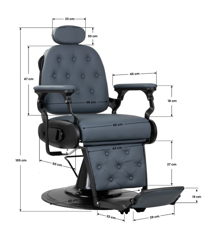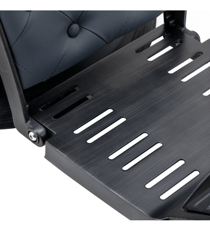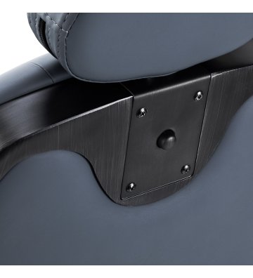 Stabilna konstrukcja podstawy z elementami w odcieniach czerni zapewnia wysoki komfort użytkowania. Wypełnienie z trwałej, odpornej na odkształcenia pianki oraz obicie wykonane z przyjemnej w dotyku skóry syntetycznej zapewniają trwałość mebla i jego komfortowe użytkowanie przez długi czas. Sprawiają również, że sprzęt jest odporny na wilgoć, wytrzymały oraz łatwy do czyszczenia. Pokrycie w odcieniach grafitu wraz z oryginalnym pikowaniem i ozdobnymi guzikami nadają mu wyjątkowego charakteru. Designerskie elementy dekoracyjne inspirowane motocyklami, nawiązujące do stylu vintage, doskonale wpasują się w klimat salonów barberskich, tworząc ich niesamowitą atmosferę.