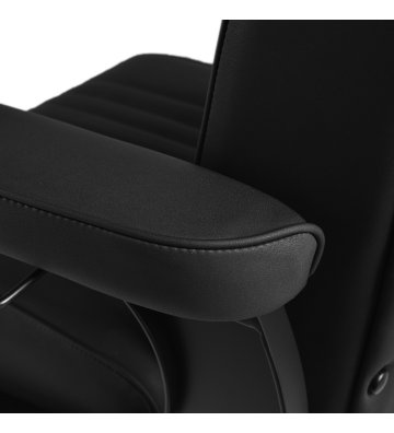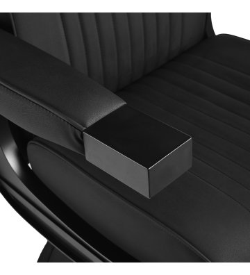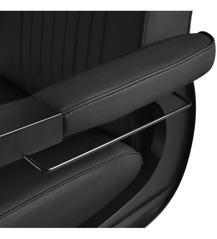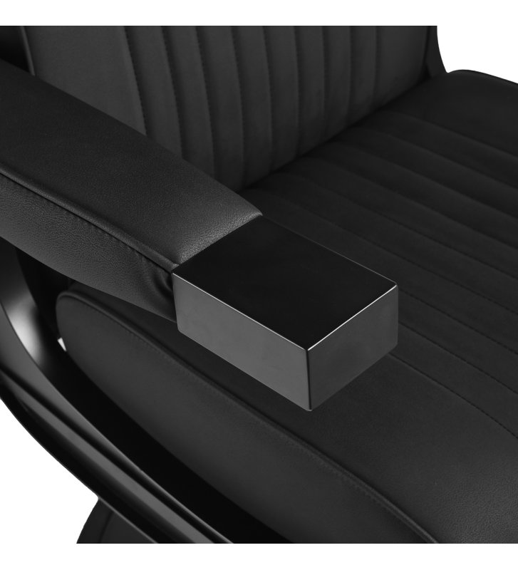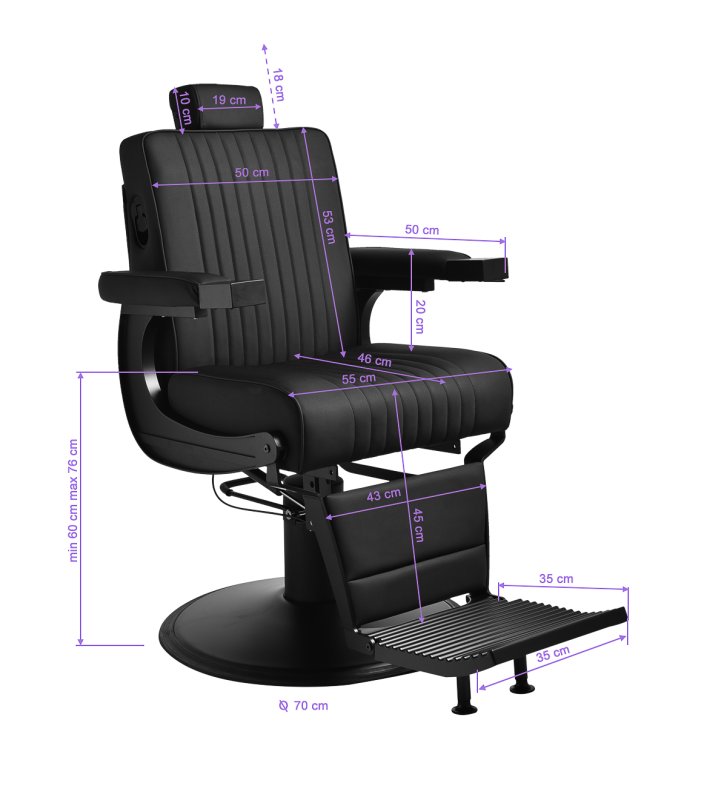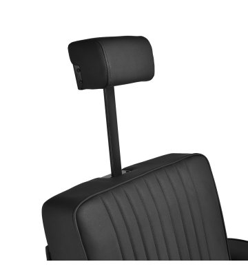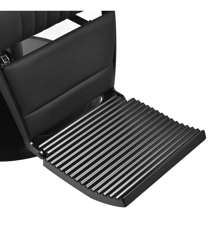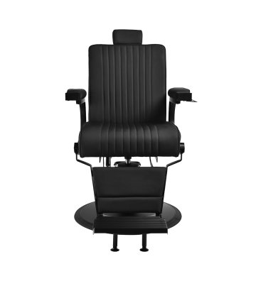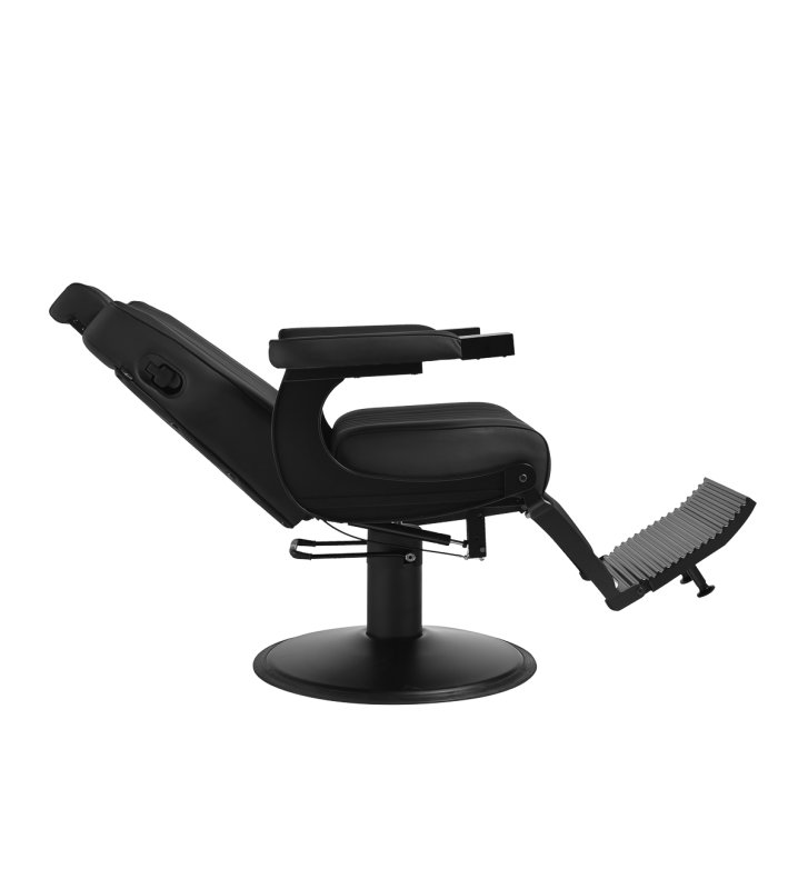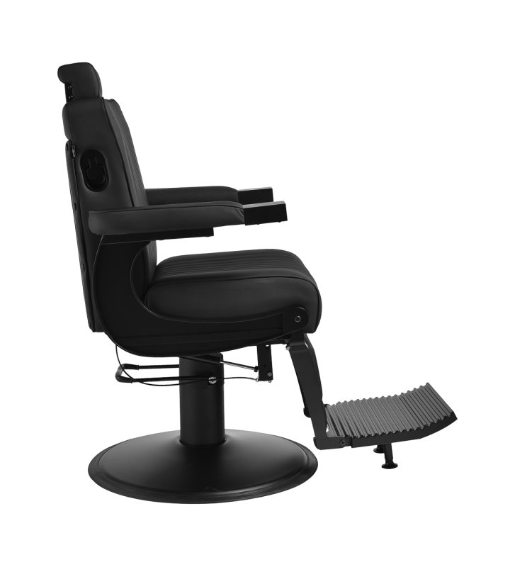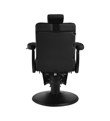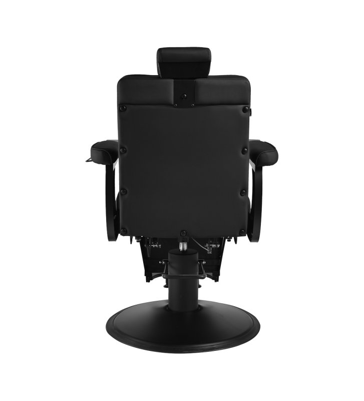 Czarna, okrągła podstawa zapewnia stabilność oraz trwałość użytkowania. Obicie z miękkiej, matowej skóry syntetycznej łączy komfort z wytrzymałością. Zastosowane materiały są odporne na wilgoć, trwałe i łatwe w czyszczeniu. Stylowe przeszycia i tapicerka w odcieniach czerni nadają mu wyjątkowego charakteru, idealnie komponującego się z wystrojem nowoczesnych salonów barberskich. Połączenie eleganckiego odcienia obicia z czarną ramą i podstawą podkreśla nowoczesny, profesjonalny wygląd fotela.