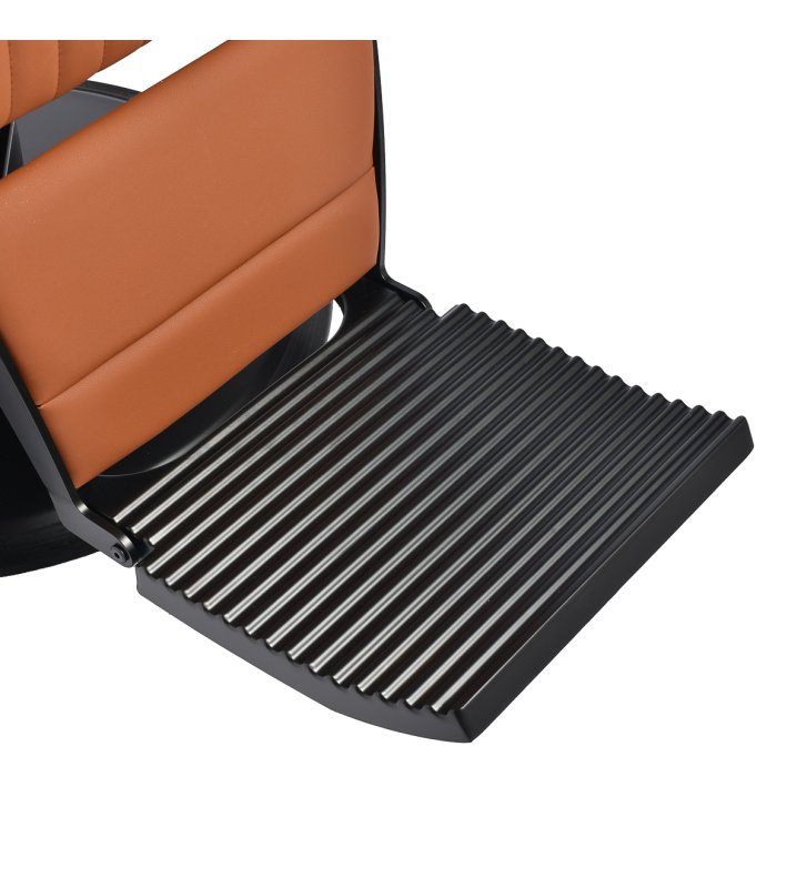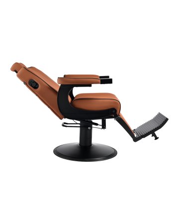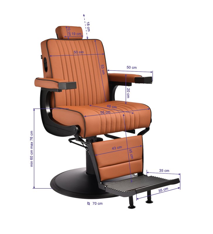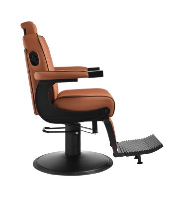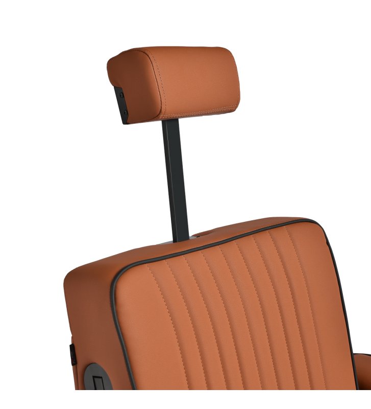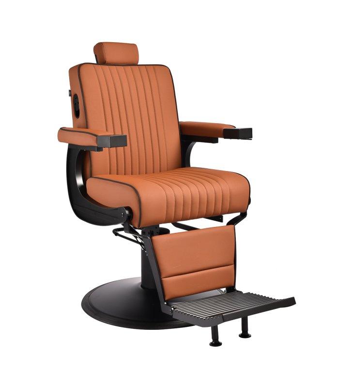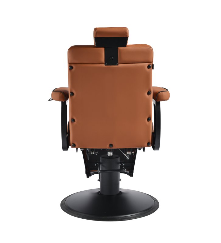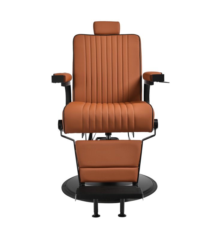 Czarna, okrągła podstawa zapewnia stabilność oraz trwałość użytkowania. Obicie z miękkiej, matowej skóry syntetycznej łączy komfort z wytrzymałością. Zastosowane materiały są odporne na wilgoć, trwałe i łatwe w czyszczeniu. Stylowe przeszycia i tapicerka w odcieniach brązu nadają mu wyjątkowego charakteru, idealnie komponującego się z wystrojem nowoczesnych salonów barberskich. Połączenie eleganckiego odcienia obicia z czarną ramą i podstawą podkreśla nowoczesny, profesjonalny wygląd fotela.