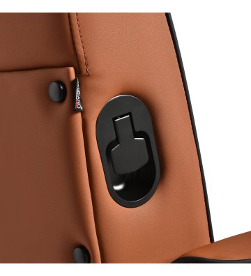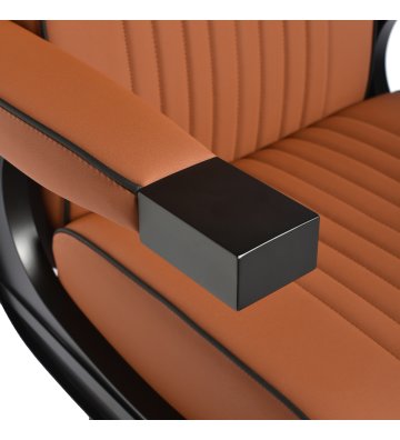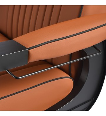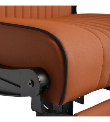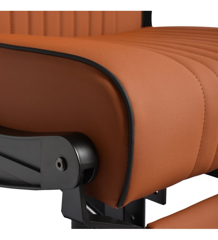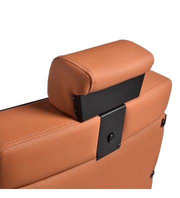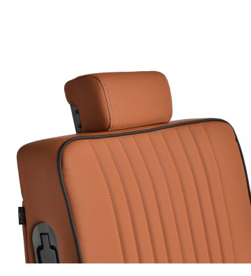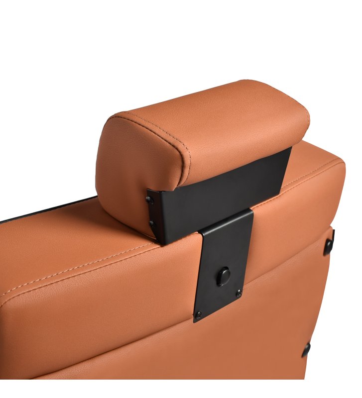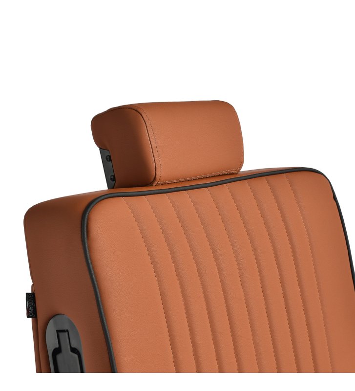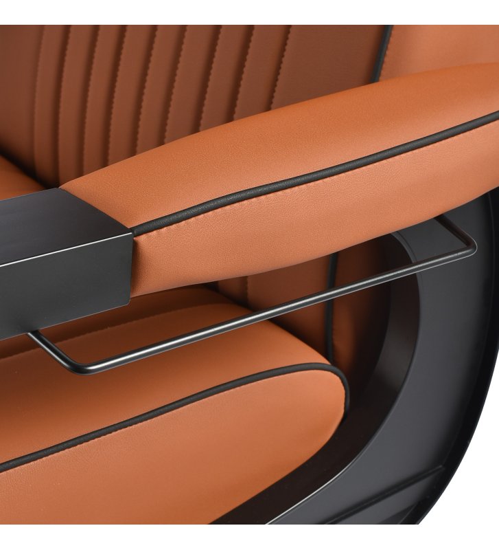 Czarna, okrągła podstawa zapewnia stabilność oraz trwałość użytkowania. Obicie z miękkiej, matowej skóry syntetycznej łączy komfort z wytrzymałością. Zastosowane materiały są odporne na wilgoć, trwałe i łatwe w czyszczeniu. Stylowe przeszycia i tapicerka w odcieniach brązu nadają mu wyjątkowego charakteru, idealnie komponującego się z wystrojem nowoczesnych salonów barberskich. Połączenie eleganckiego odcienia obicia z czarną ramą i podstawą podkreśla nowoczesny, profesjonalny wygląd fotela.