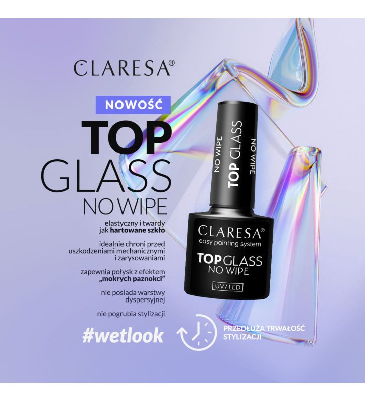 Claresa Glass Top to właśnie płynne szkło hartowane dla Twoich paznokci! Uniwersalny transparentny top hybrydowy nadaje się zarówno do przedłużonych paznokci, jak i naturalnej płytki. Jego formuła jest elastyczna, doskonale chroni przed uszkodzeniami mechanicznymi i zapewnia połysk z efektem mokrych paznokci. Top nie pogrubia płytki, jednocześnie dokładnie ją zabezpieczając. Produkt idealnie oddaje kolor lakierów hybrydowych ‒ i jasnych, i tych ciemnych. Nie wymaga przemywania warstwy dyspersyjnej.
