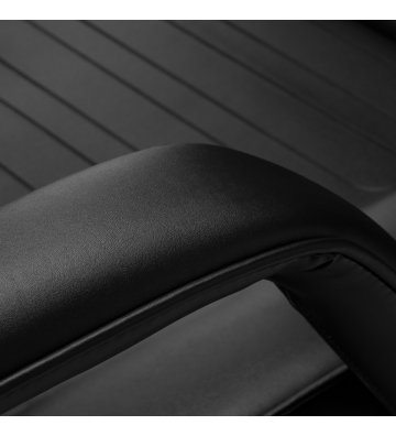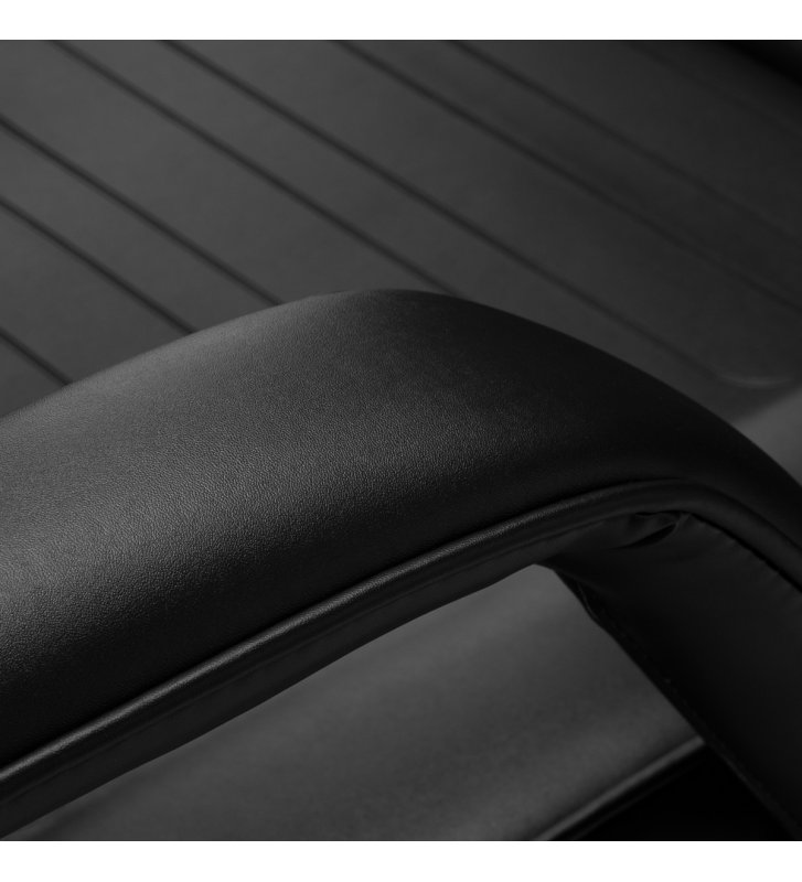 Fotel wypełniony jest pianką o odpowiedniej twardości i pokryty półmatową imitacją skóry w odcieniach czerni. Dzięki użyciu takiego materiału, sprzęt jest komfortowy w użytkowaniu, odporny na wilgoć oraz łatwy w czyszczeniu. Odpowiednio wyprofilowane obszycia nadają ergonomiczny kształt siedzisku. Solidna konstrukcja gwarantuje trwałość oraz stabilność. Prosty design i klasyczna kolorystyka pozwalają mu wpasować się w każde wnętrze.