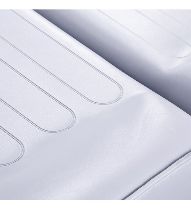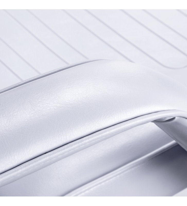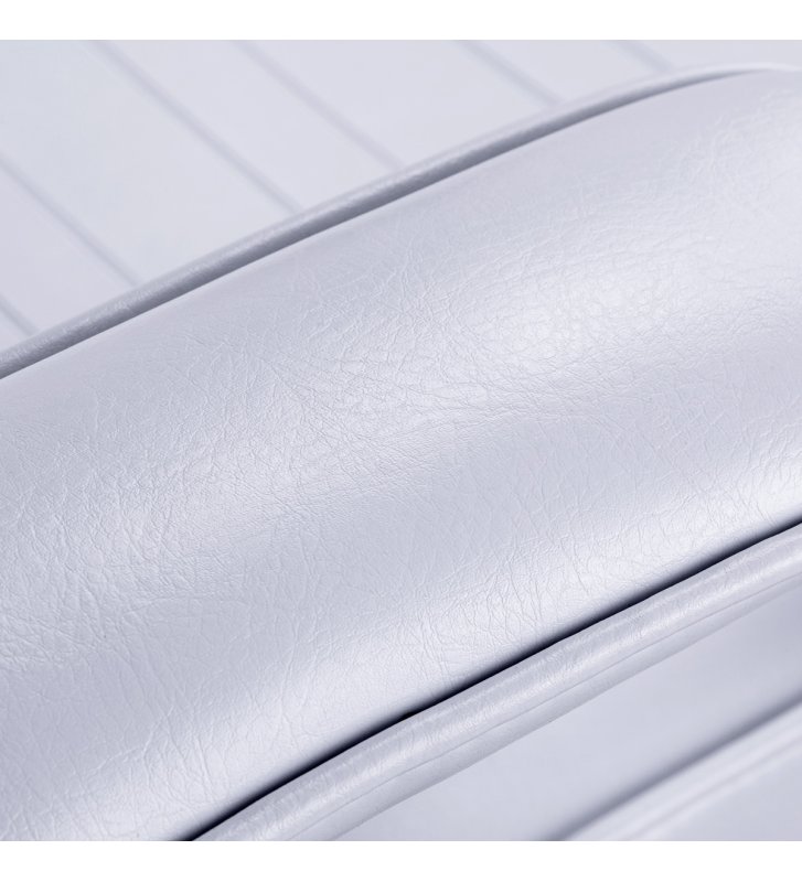Fotel wypełniony jest pianką o odpowiedniej twardości i pokryty półmatową imitacją skóry w odcieniach bieli. Dzięki użyciu takiego materiału, sprzęt jest komfortowy w użytkowaniu, odporny na wilgoć oraz łatwy w czyszczeniu. Odpowiednio wyprofilowane obszycia nadają ergonomiczny kształt siedzisku. Solidna konstrukcja gwarantuje trwałość oraz stabilność. Prosty design i klasyczna kolorystyka pozwalają mu wpasować się w każde wnętrze.