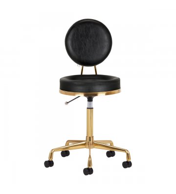 This black and gold stool has a comfortable seat and backrest covered with ecological leather. It is located on a stable five-star base. Constructed of metal parts, it is durable and resistant to damage. The seat height is efficiently adjustable. Plastic wheels allow for easy repositioning. The seat is fully rotatable.
