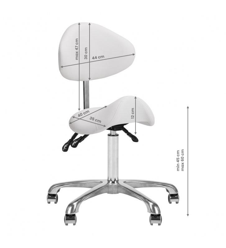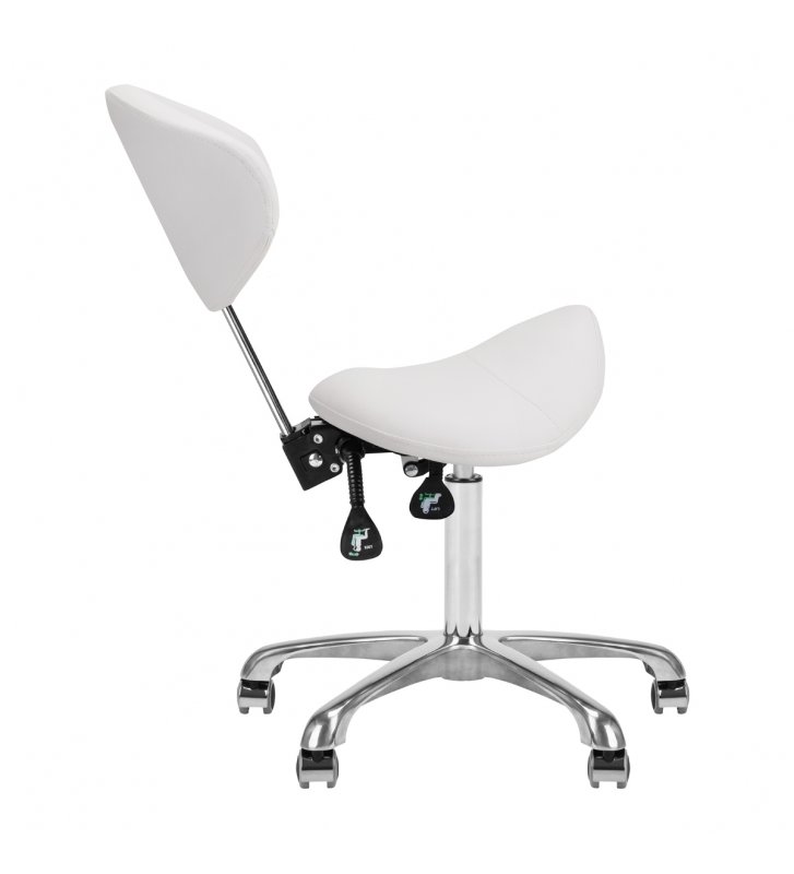 A comfortable, exclusive, stable cosmetic stool with a backrest and a profiled seat, on a very stable five-arm base. Adjustable in three levels: