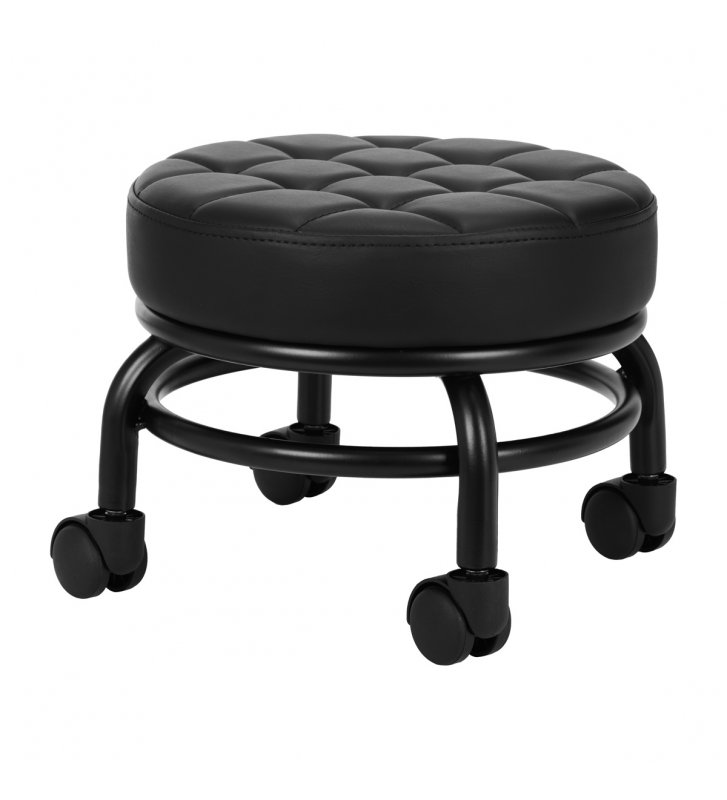 Comfortable cosmetic stool made of ecological leather. Stable structure mounted on a four-arm base, with plastic wheels, available in black.