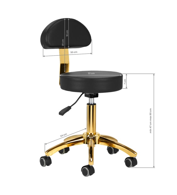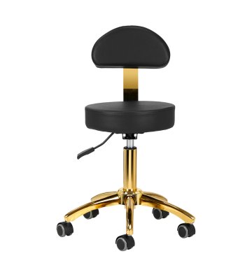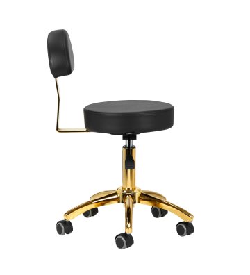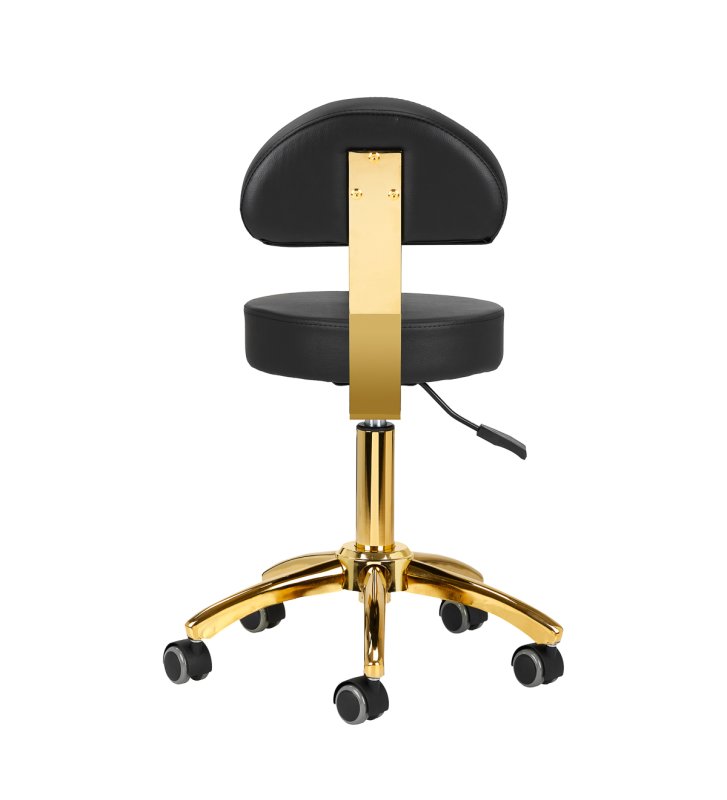 Pięcioramienna podstawa zapewnia stabilność oraz poczucie bezpieczeństwa, nawet podczas bardziej dynamicznych ruchów i częstych zmian pozycji. Wyposażenie w wytrzymałe koła zapewnia wysoką mobilność, co pozwala na swobodne przemieszczanie się po salonie czy gabinecie. Obicie ze skóry syntetycznej w odcieniach czerni, które jest nie tylko trwałe, ale także łatwe do utrzymania w czystości. Estetyczne obszycia i pikowanie nadają mu wyjątkowy wygląd, a złote elementy ozdobne dodają luksusowego charakteru, który przyciąga uwagę. Wyjątkowe połączenie elegancji oraz komfortu czyni taboret niezastąpionym narzędziem w pracy każdego profesjonalisty.