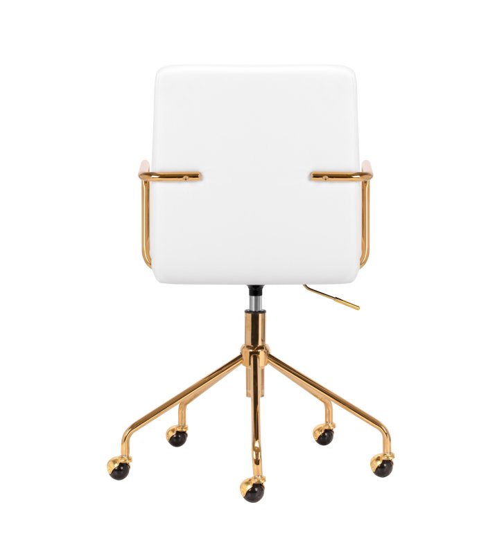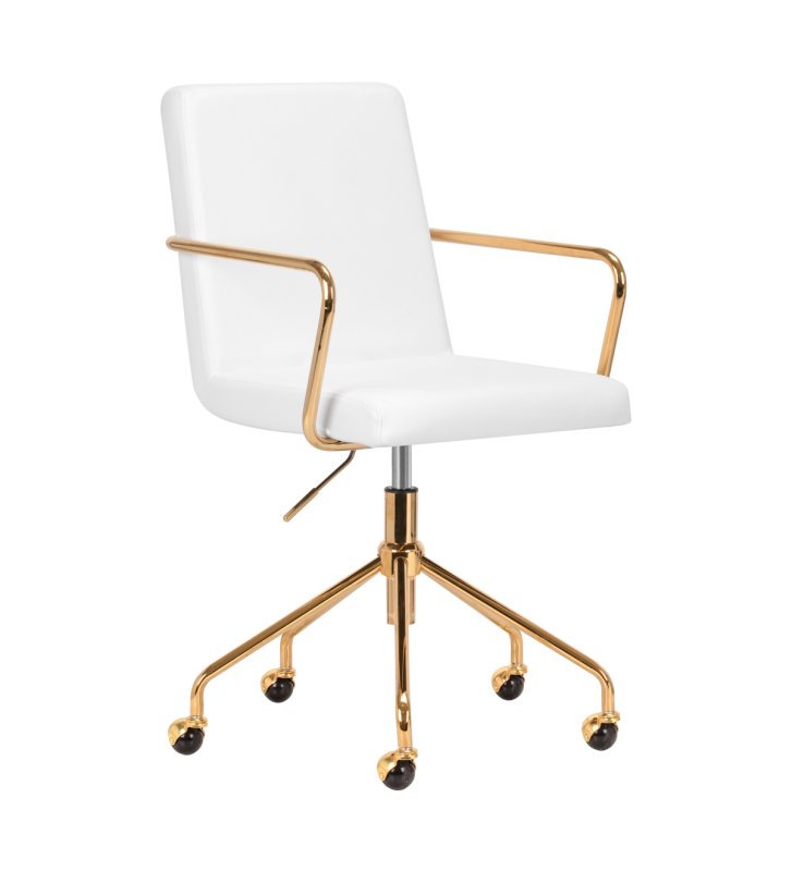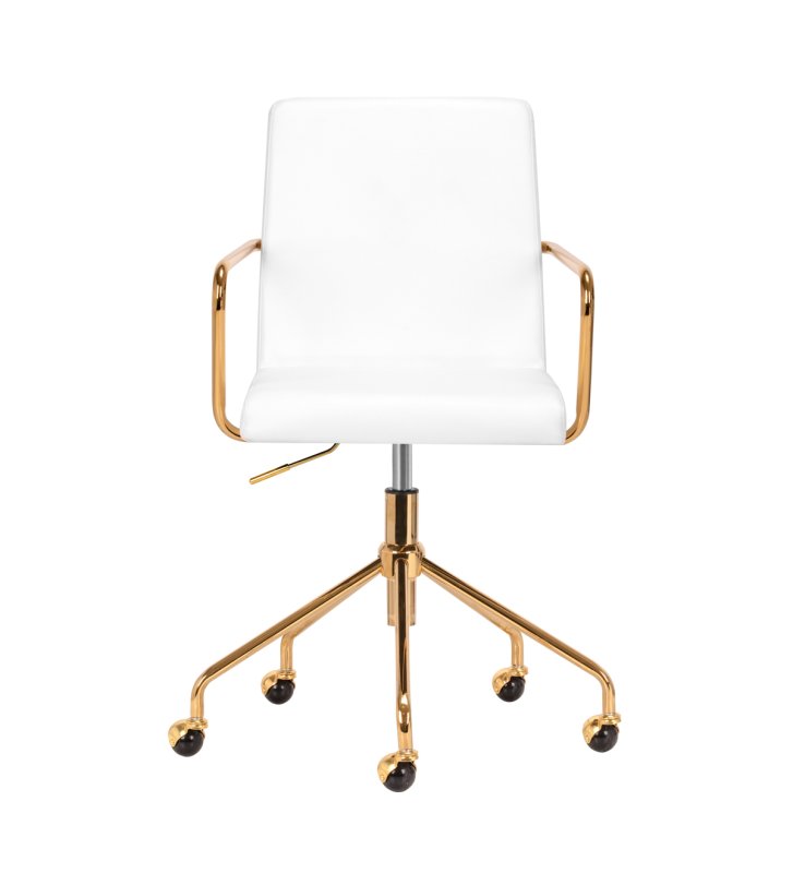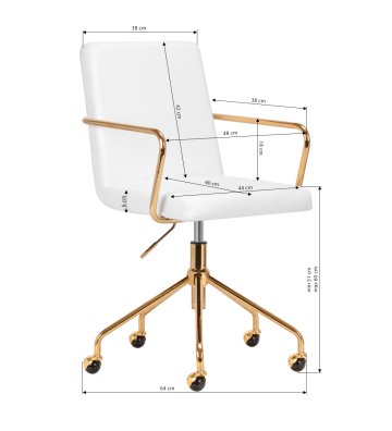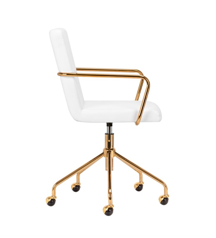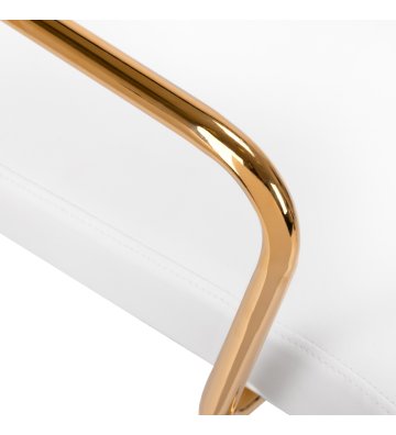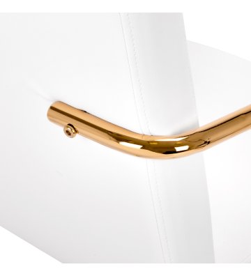 Pleasant to the touch , synthetic leather upholstery in shades of white gives the furniture a unique character. The elegant finish makes the furniture eye-catching. The frame in shades of gold adds elegance, perfectly matching simple shapes. Functional wheels provide significant mobility, making it easier to move the chair and move around the living room while working. Aesthetics of workmanship, comfort of use and ergonomically profiled backrest make the chair meet the requirements of even the most demanding users.