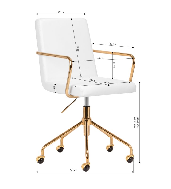 The efficient gas lift allows for easy and smooth adjustment of the seat height within 51-60 cm . This allows you to adjust the furniture to your individual needs and services, ensuring high comfort of use - both when applying makeup, eyebrow styling, and during other activities. The full rotation mechanism improves work efficiency and comfort. The metal armrests are at the right height, allowing for proper shoulder positioning.