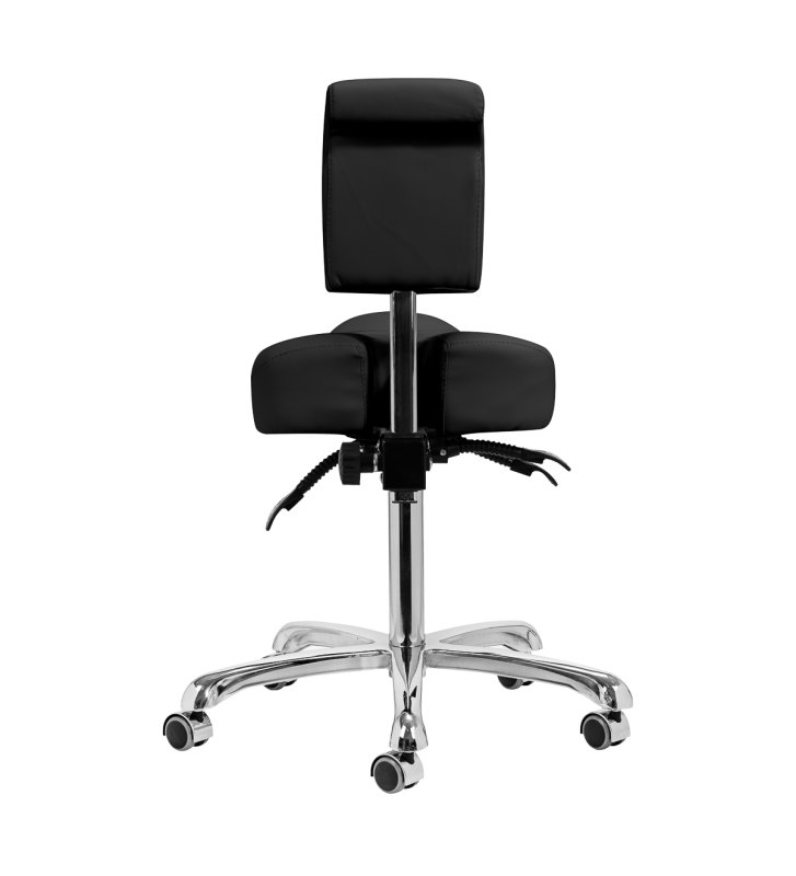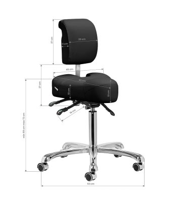 The possibility of height adjustment in the range of 55-72 cm allows you to take the right position while performing services. Perfectly profiled backrest with adjustment provides optimal support for the lumbar section , minimizing fatigue during long-term work. The full rotation mechanism makes work more effective and comfortable. The stool also has a cradle function with the possibility of locking , which allows for ergonomic body positioning. The seat provides tilt and height adjustment thanks to gas cylinders. Additionally, the height of the backrest can be manually adjusted for full comfort of use.