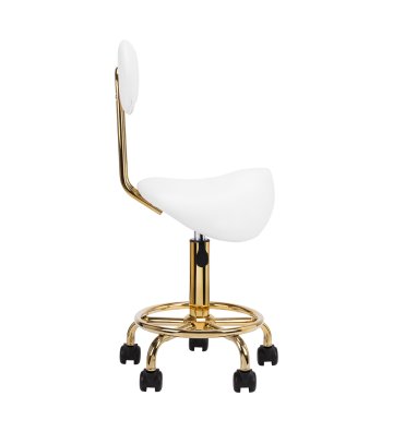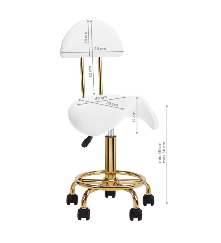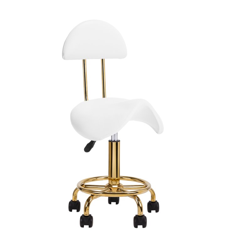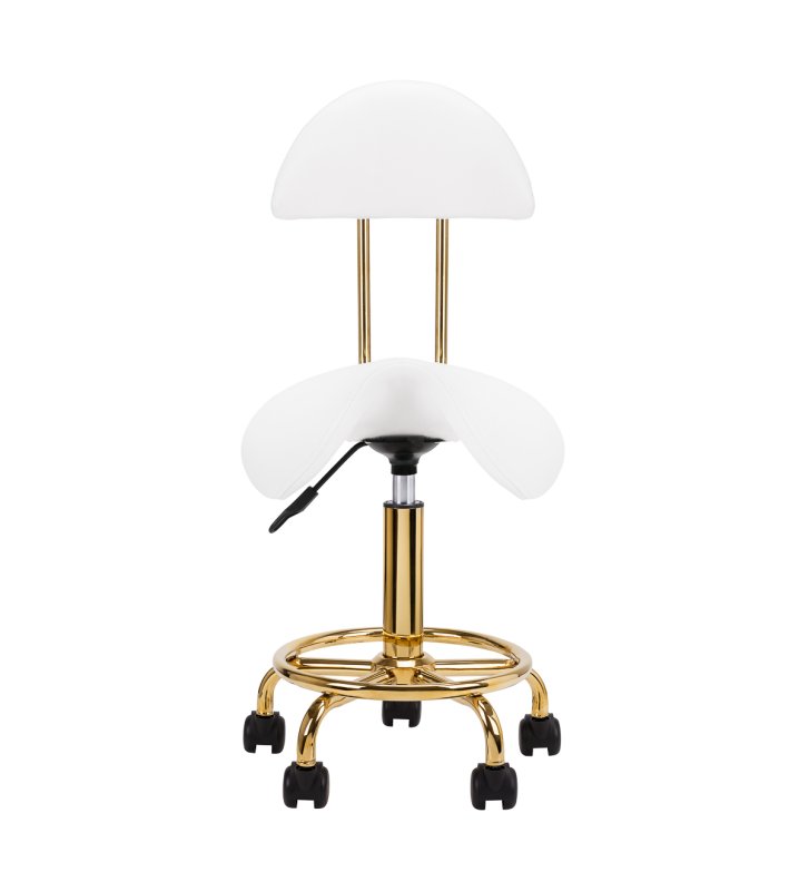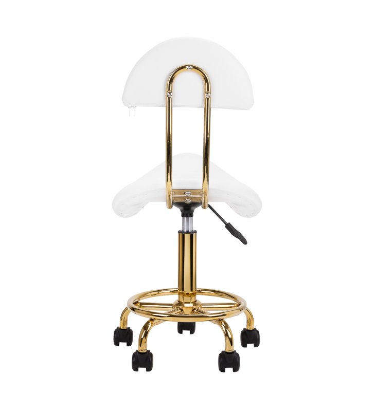 Pięcioramienna podstawa w odcieniach złota wyposażona jest w kółka, które zapewniają znaczną mobilność, ułatwiając łatwe przemieszczanie mebla po gabinecie. Obicie taboretu wykonano z przyjemnej w dotyku imitacji skóry w odcieniach bieli. Dzięki użyciu takiego materiału taboret jest trwały, odporny na wilgoć i łatwy w czyszczeniu.