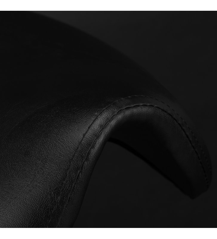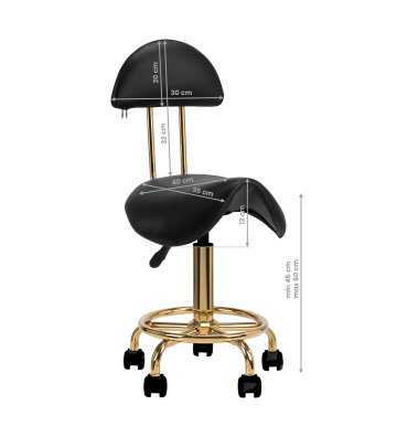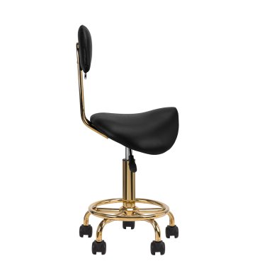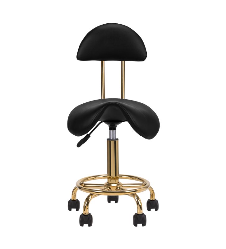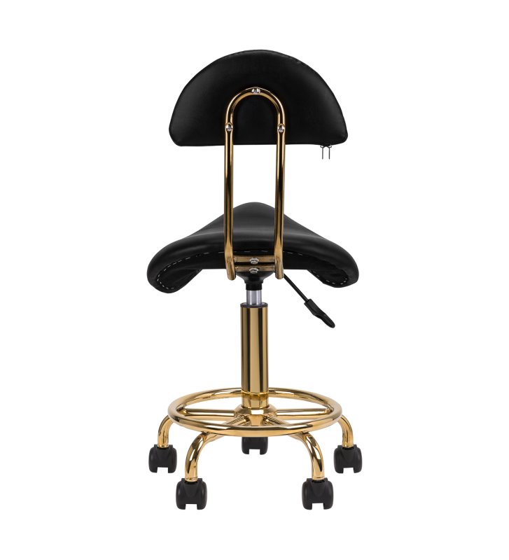 Pięcioramienna podstawa w odcieniach złota wyposażona jest w kółka, które zapewniają znaczną mobilność, ułatwiając łatwe przemieszczanie mebla po gabinecie. Obicie taboretu wykonano z przyjemnej w dotyku imitacji skóry w odcieniach czerni. Dzięki użyciu takiego materiału taboret jest trwały, odporny na wilgoć i łatwy w czyszczeniu.