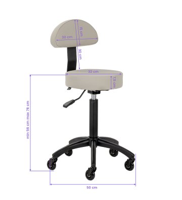 Regulacja wysokości siedziska w zakresie 56-76 cm umożliwia dopasowanie pozycji do indywidualnych potrzeb specjalisty podczas wykonywania usług. Oparcie wspiera kręgosłup, zapewniając komfort nawet w trakcie długotrwałej pracy. Mechanizm pełnego obrotu zwiększa swobodę ruchów, co przekłada się na większą wygodę i efektywność pracy. Mobilność zapewniają kółka Roll Speed z żelaznym rdzeniem i powłoką z poliuretanu (PU), które łączą płynność ruchu z wyjątkową odpornością na zużycie. Zastosowanie łożysk klasy ABEC-7 sprawia, że taboret porusza się łatwo, co znacząco ułatwia manewrowanie.