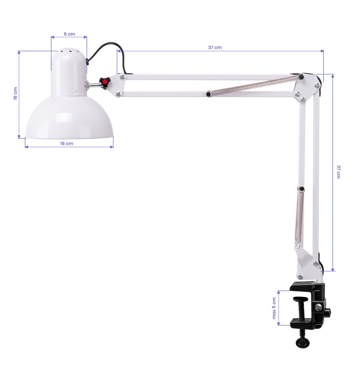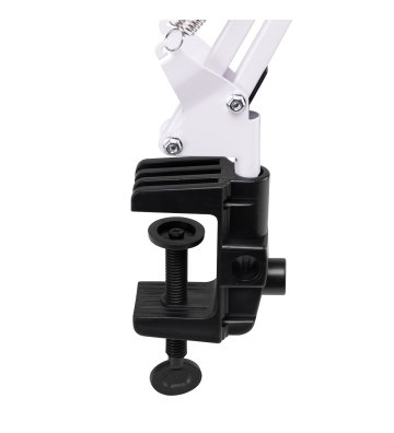 Dzięki uchwytowi działającemu na zasadzie imadła lampę można łatwo zamontować do blatu. Maksymalne rozwarcie uchwytu wynosi 5 cm, co pozwala na dopasowanie do większości powierzchni roboczych. Możliwość zamontowania lampy w różnych ustawieniach statywu zapewnia dużą elastyczność i pozwala na precyzyjne dopasowanie jej pozycji. Dzięki temu lampa oferuje szerokie możliwości personalizacji, umożliwiając dostosowanie oświetlenia do indywidualnych potrzeb użytkownika.