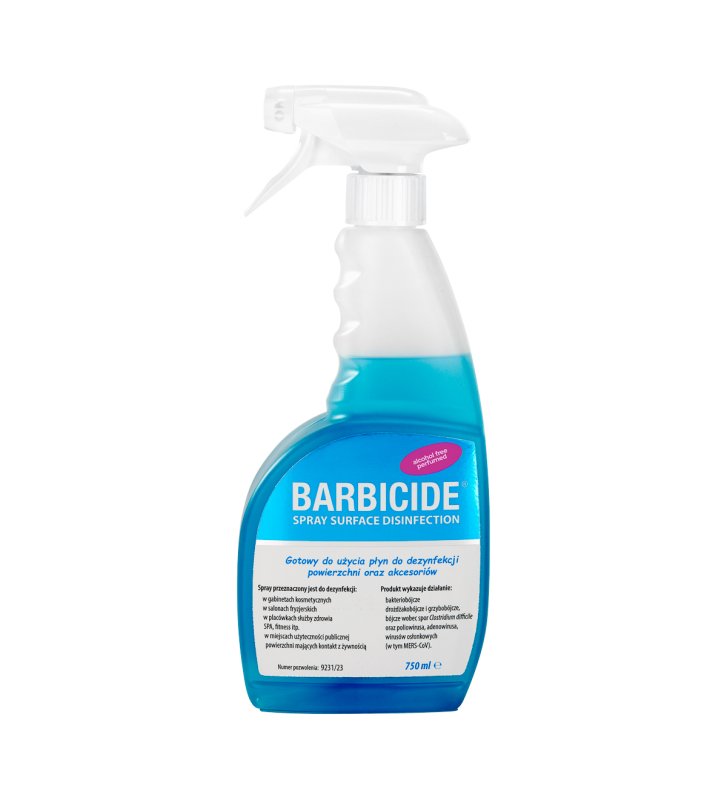 Do usunięcia z powierzchni mechanicznych zabrudzeń poleca się Chusteczki dezynfekcyjne Barbicide, a następnie spryskanie powierzchni Spray’em.
