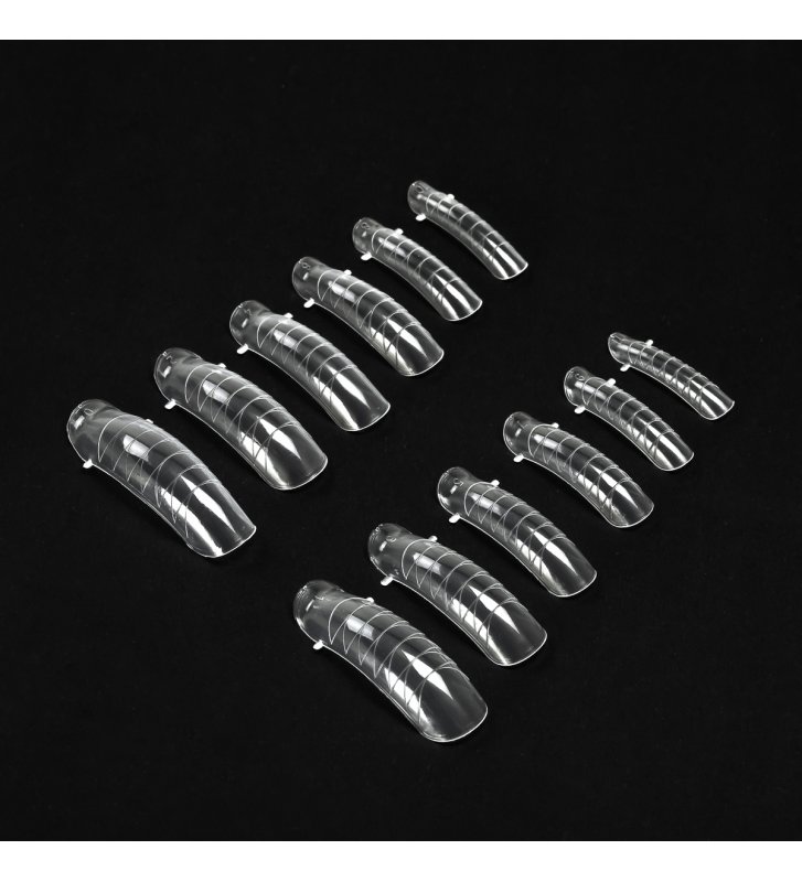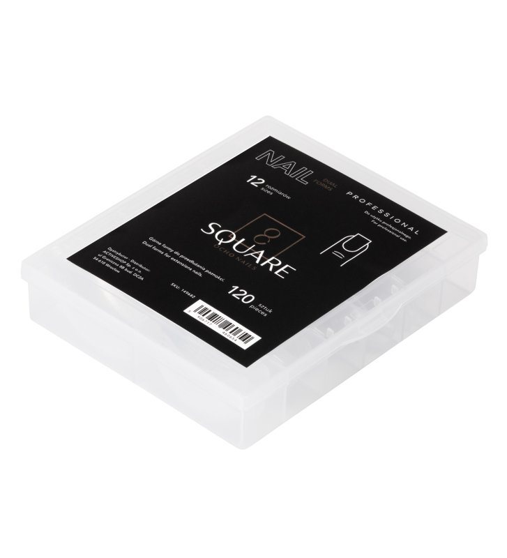 Górne formy w kształcie kwadrata wyróżniają się wyjątkową elastycznością i trwałością, co pozwala na komfortową pracę bez obaw o ich uszkodzenie. Pomocnicze linie ułatwiają nadanie paznokciom wybranej długości, a przezroczysty materiał zapewnia skuteczne utwardzanie w lampie UV/LED. 12 rozmiarów pozwala na idealne dopasowanie formy do naturalnej płytki, co ułatwia uzyskanie perfekcyjnego efektu.
